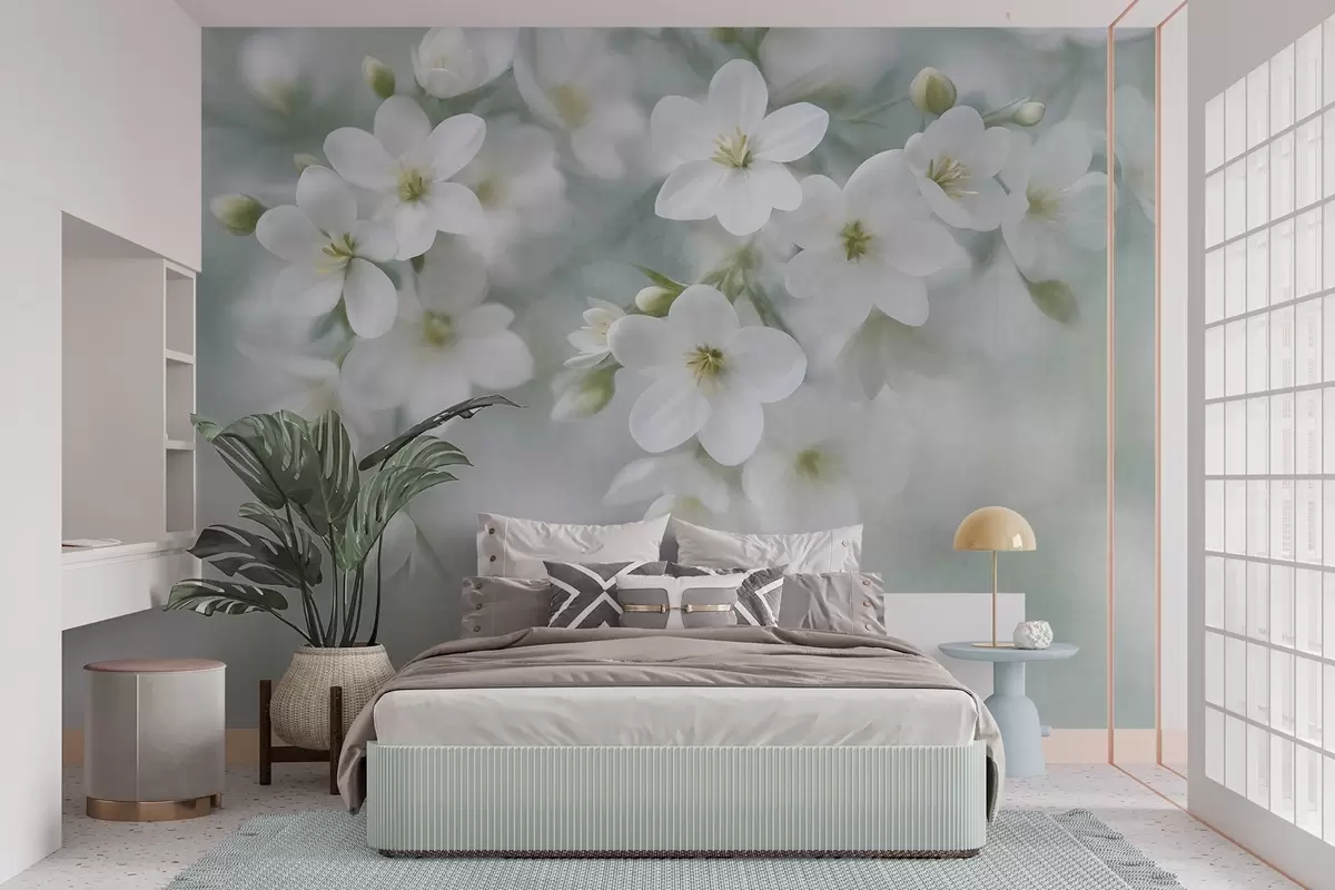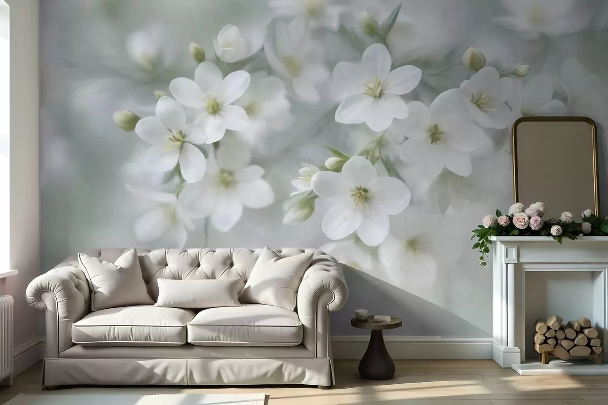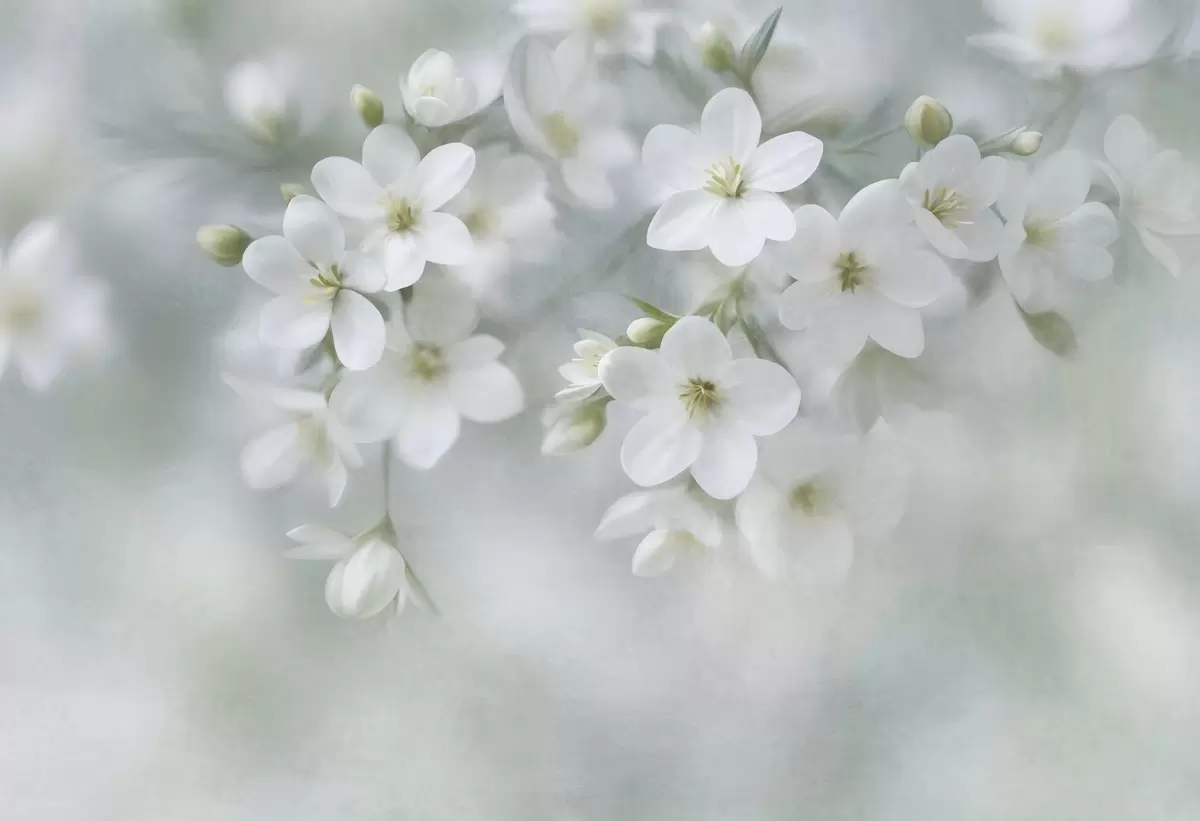 Papier peint Des fleurs blanches à la texture délicate, légèrement floues en arrière-plan N° w09759