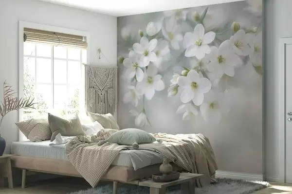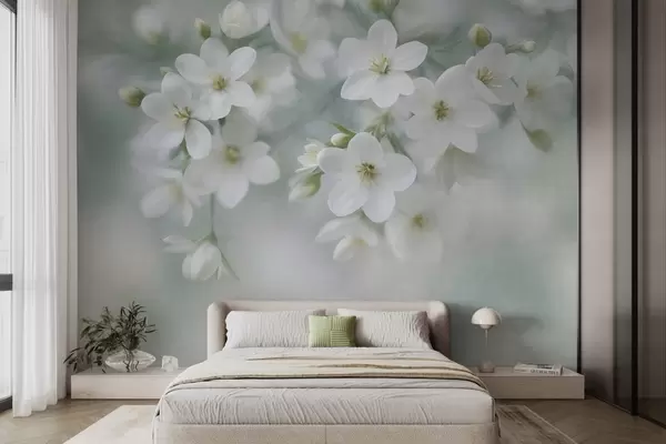 Papier peint Des fleurs blanches à la texture délicate, légèrement floues en arrière-plan N° w09759
