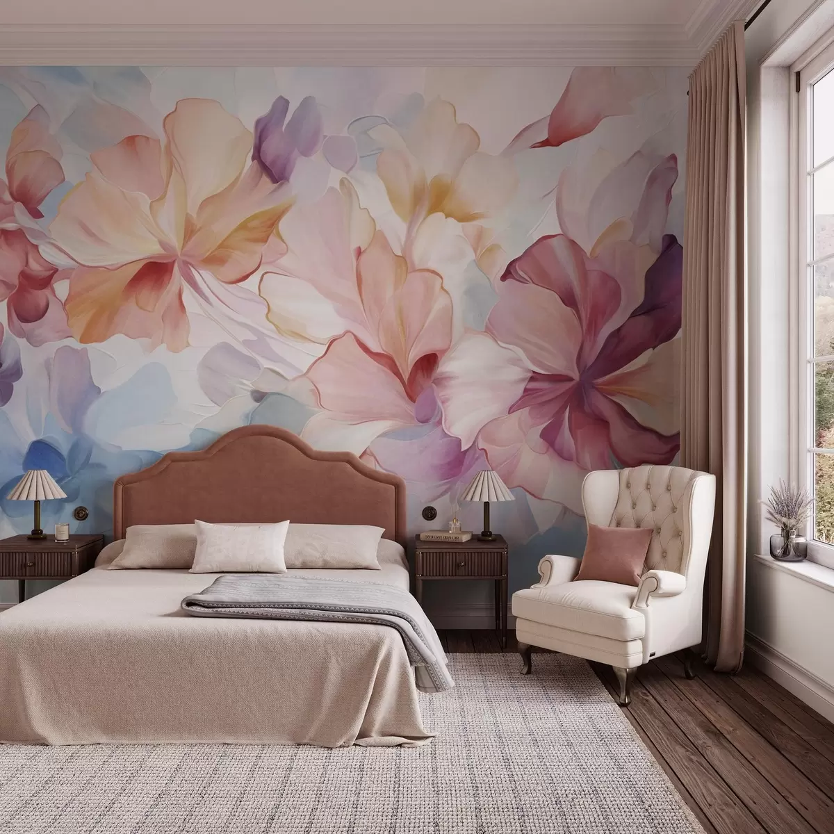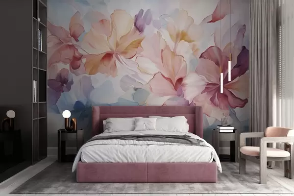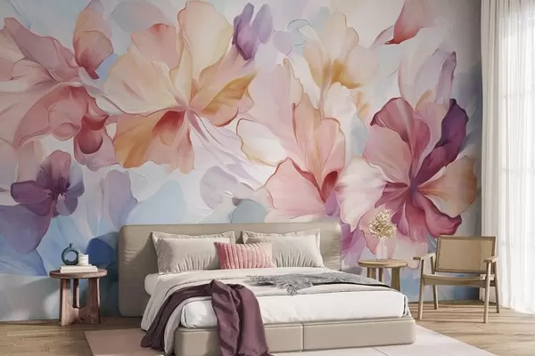 Papier peint Fleurs fantaisistes abstraites dans des tons de rose, de pêche et de lavande, dans un style pictural et texturé N° w09767