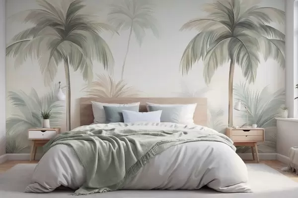 Papier peint Des palmiers aux feuilles texturées, d'un vert et d'un beige discrets, se détachant sur un ciel clair N° w09770