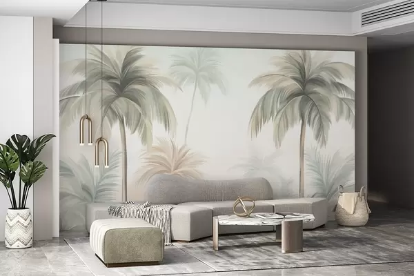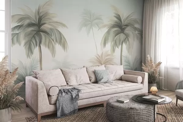 Papier peint Des palmiers aux feuilles texturées, d'un vert et d'un beige discrets, se détachant sur un ciel clair N° w09770