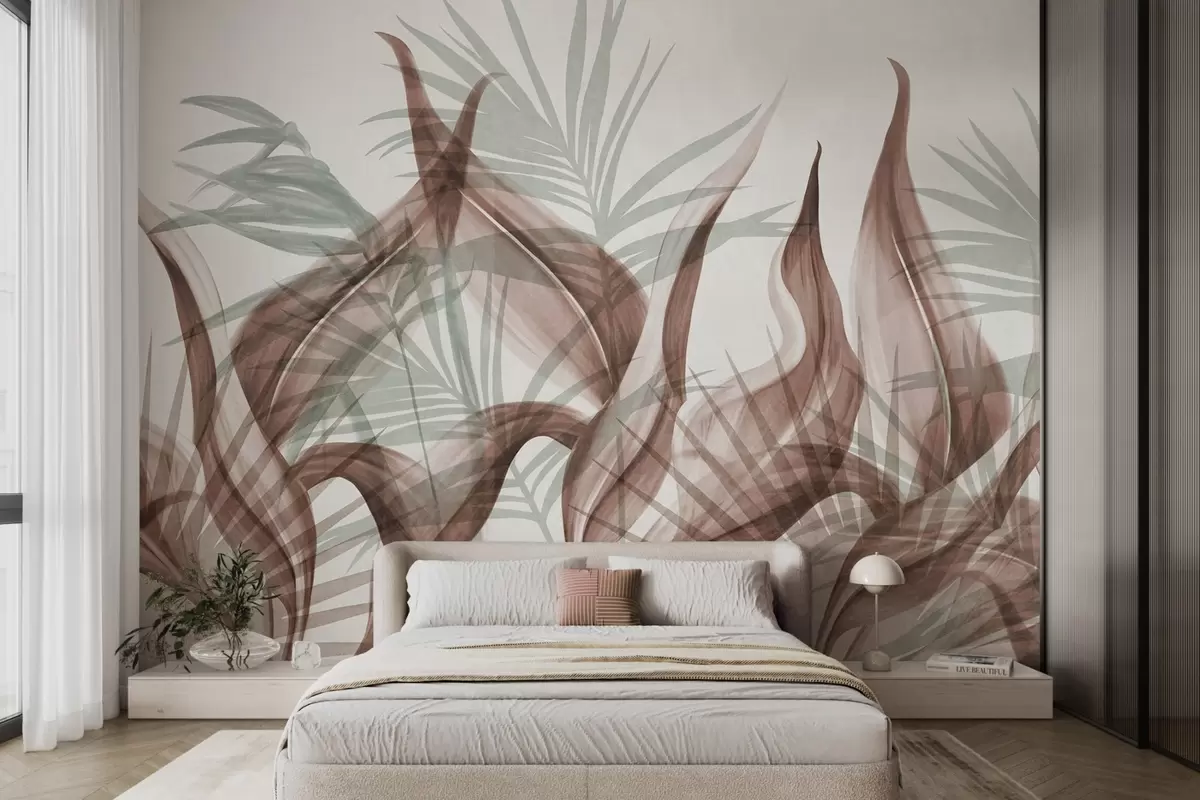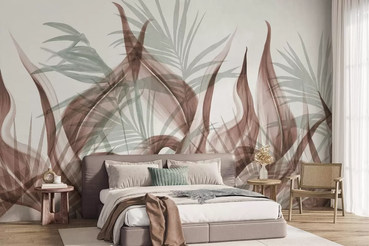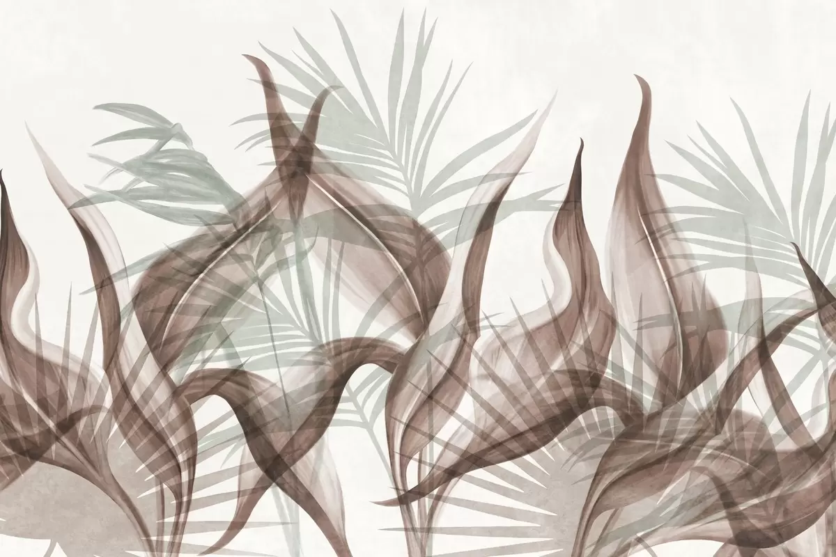Papier peint Feuilles tropicales dans des tons de brun et de vert sur fond blanc, style aquarelle texturé N° w09772