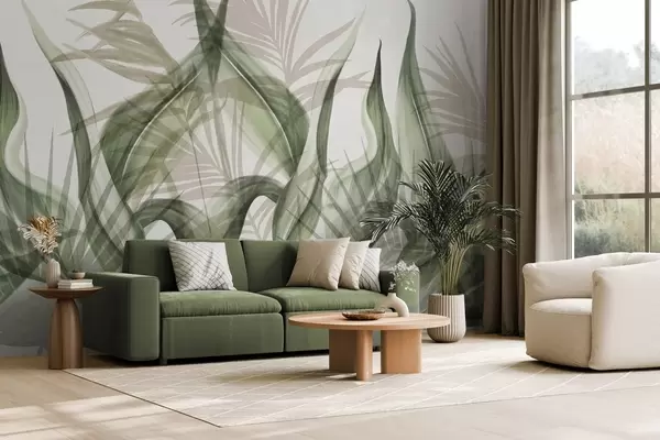 Papier peint Feuilles tropicales dans des tons de beige et de vert sur fond blanc, style aquarelle texturé N° w09772v1