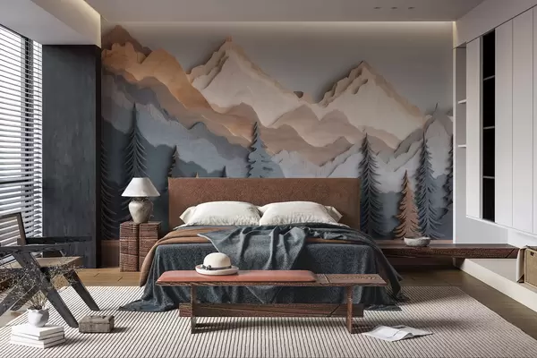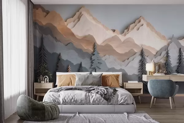 Papier peint Paysage naturel avec des pins et des montagnes, dans un style de sculpture sur bois N° w09793
