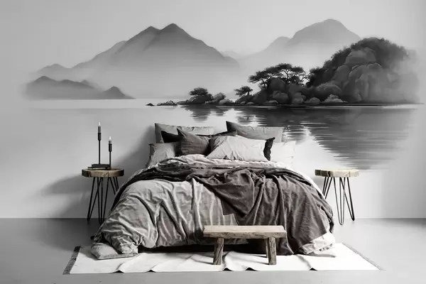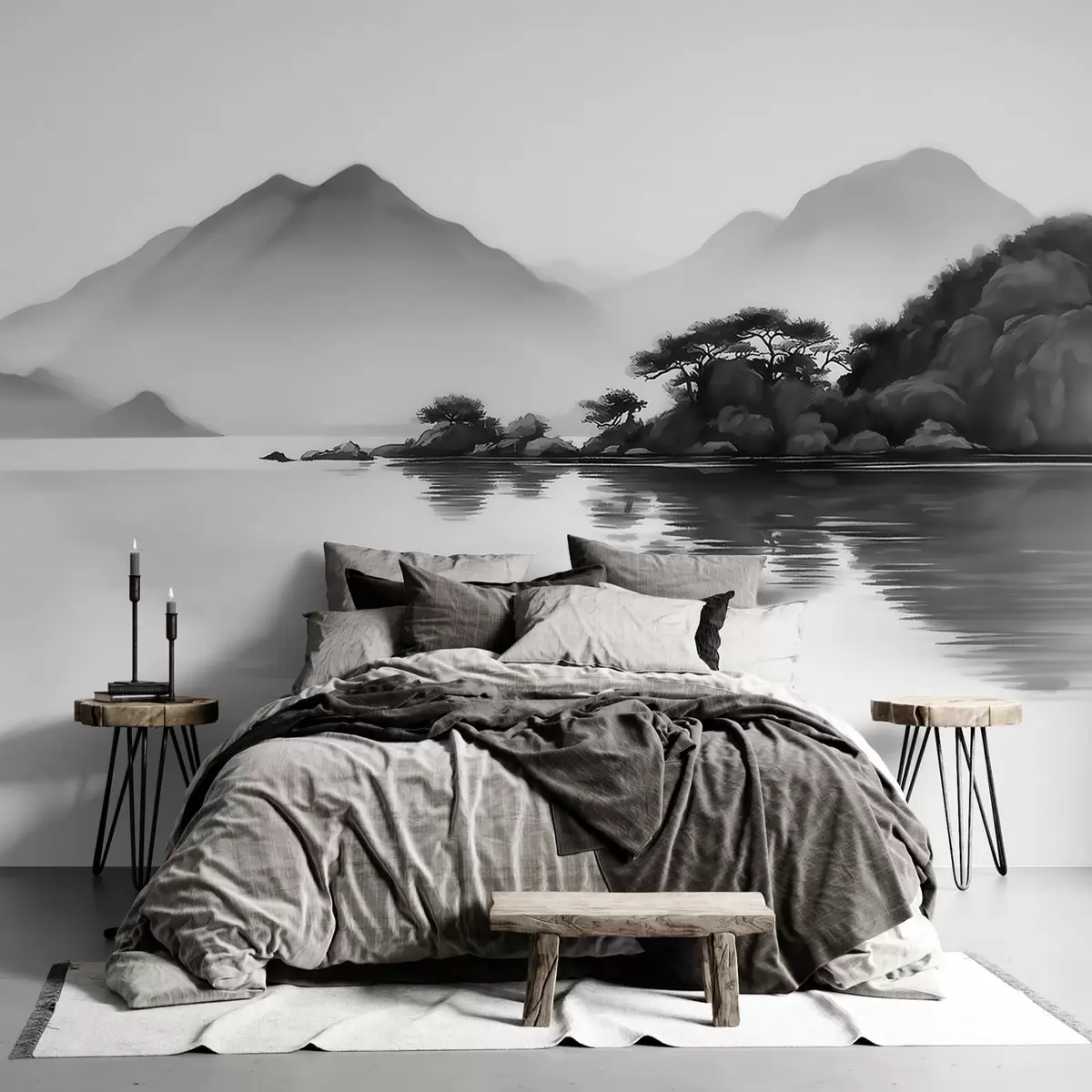 Papier peint Paysage en noir et blanc avec des montagnes et un lac dans une brume légère N° w09803
