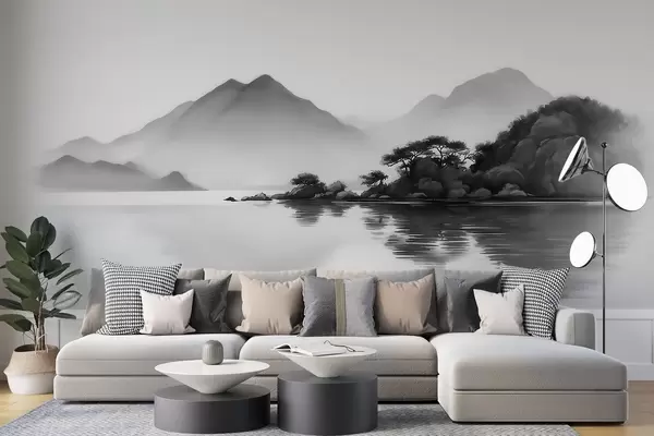 Papier peint Paysage en noir et blanc avec des montagnes et un lac dans une brume légère N° w09803