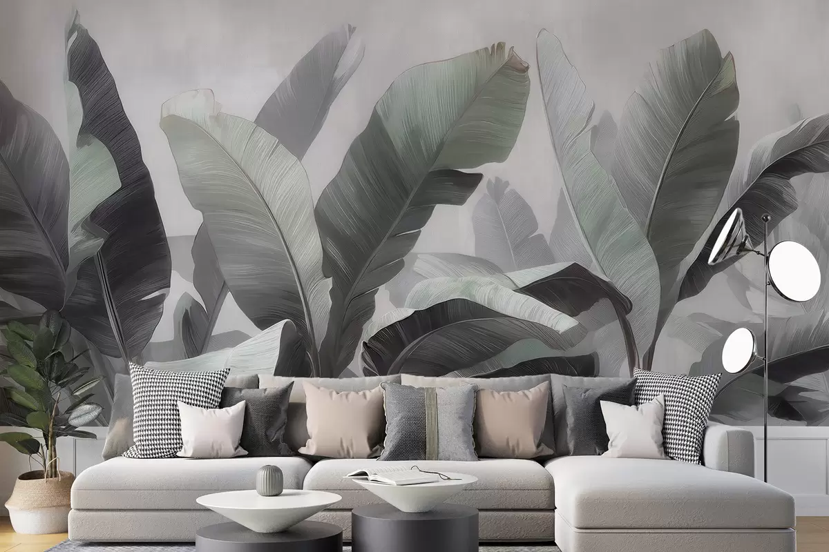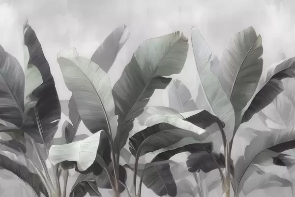 Papier peint Grandes feuilles de bananier stylisées dans une palette neutre aux tons gris-vert doux N° w09805