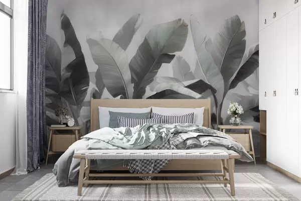 Papier peint Grandes feuilles de bananier stylisées dans une palette neutre aux tons gris-vert doux N° w09805