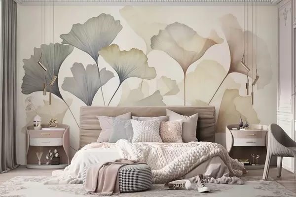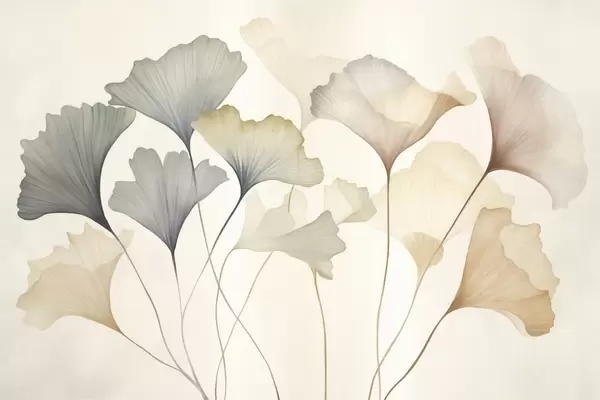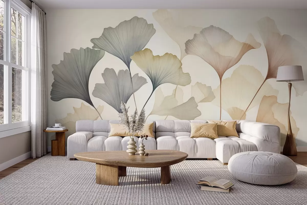 Papier peint Feuilles de ginkgo stylisées dans des tons pastel discrets tels que le bleu, le vert et le pêche, œuvre d'art texturée N° w09810