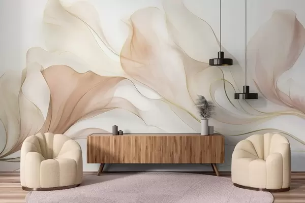 Papier peint Une texture fluide et abstraite dans des tons pêche et crème, rehaussée de lignes délicates N° w09815