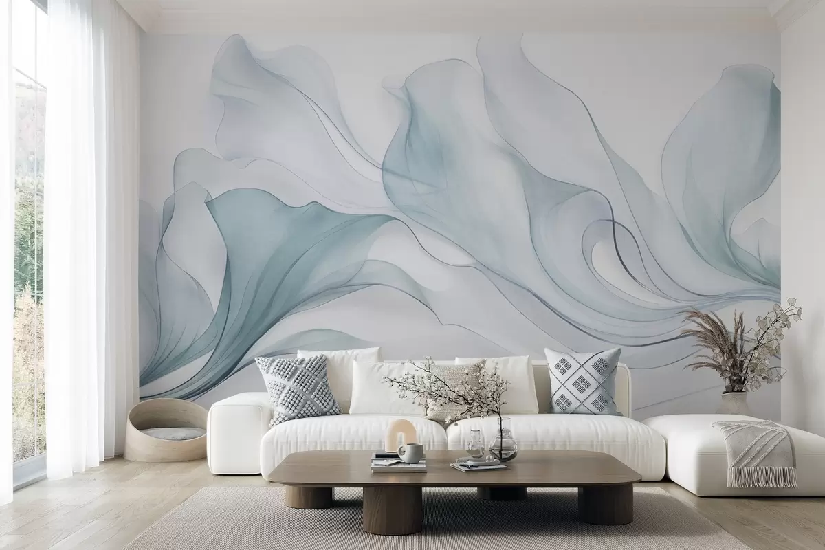 Papier peint Une texture fluide et abstraite dans des nuances de bleu, rehaussée de lignes délicates N° w09815v1