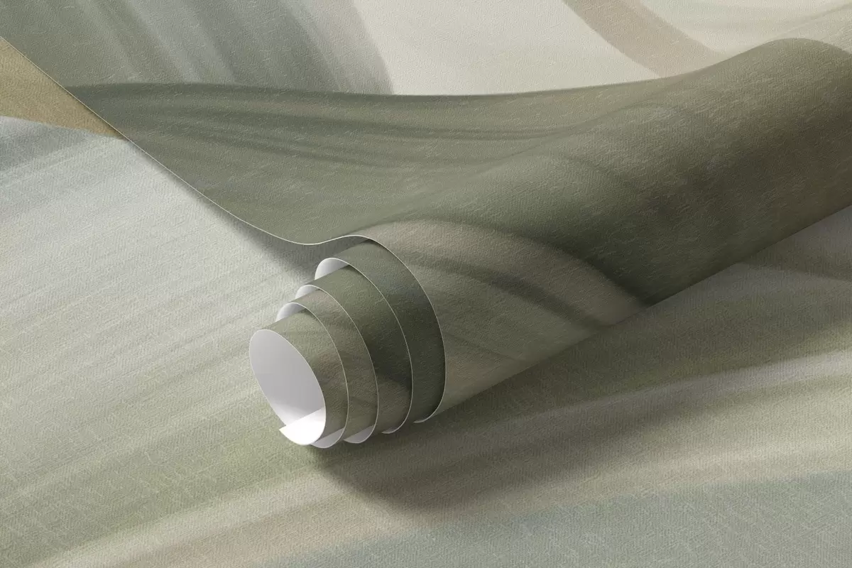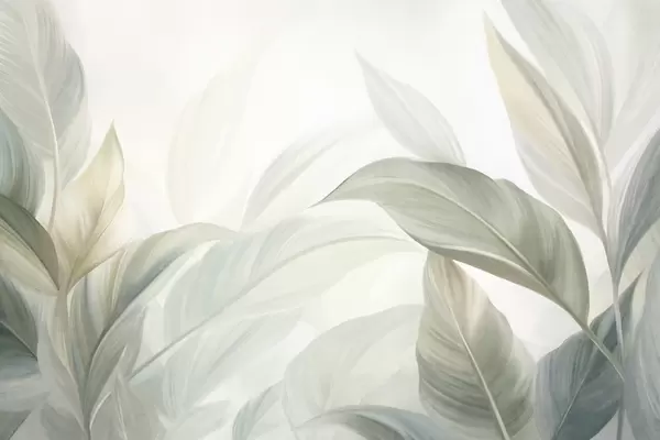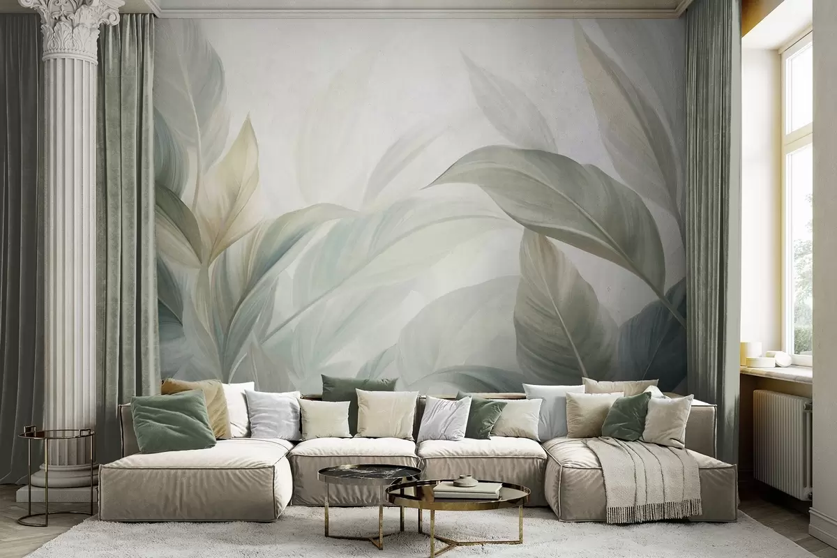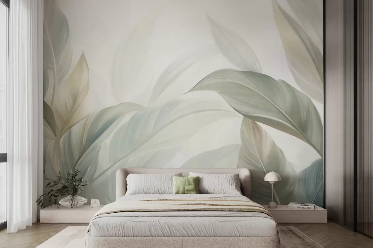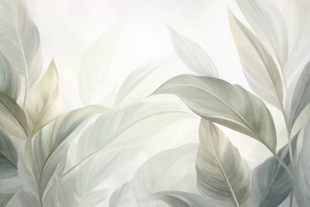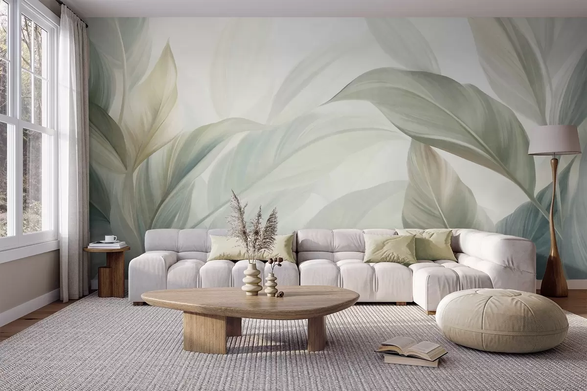 Papier peint De grandes feuilles tropicales vert pâle aux couleurs douces et pastel, dans un style artistique texturé N° w09816