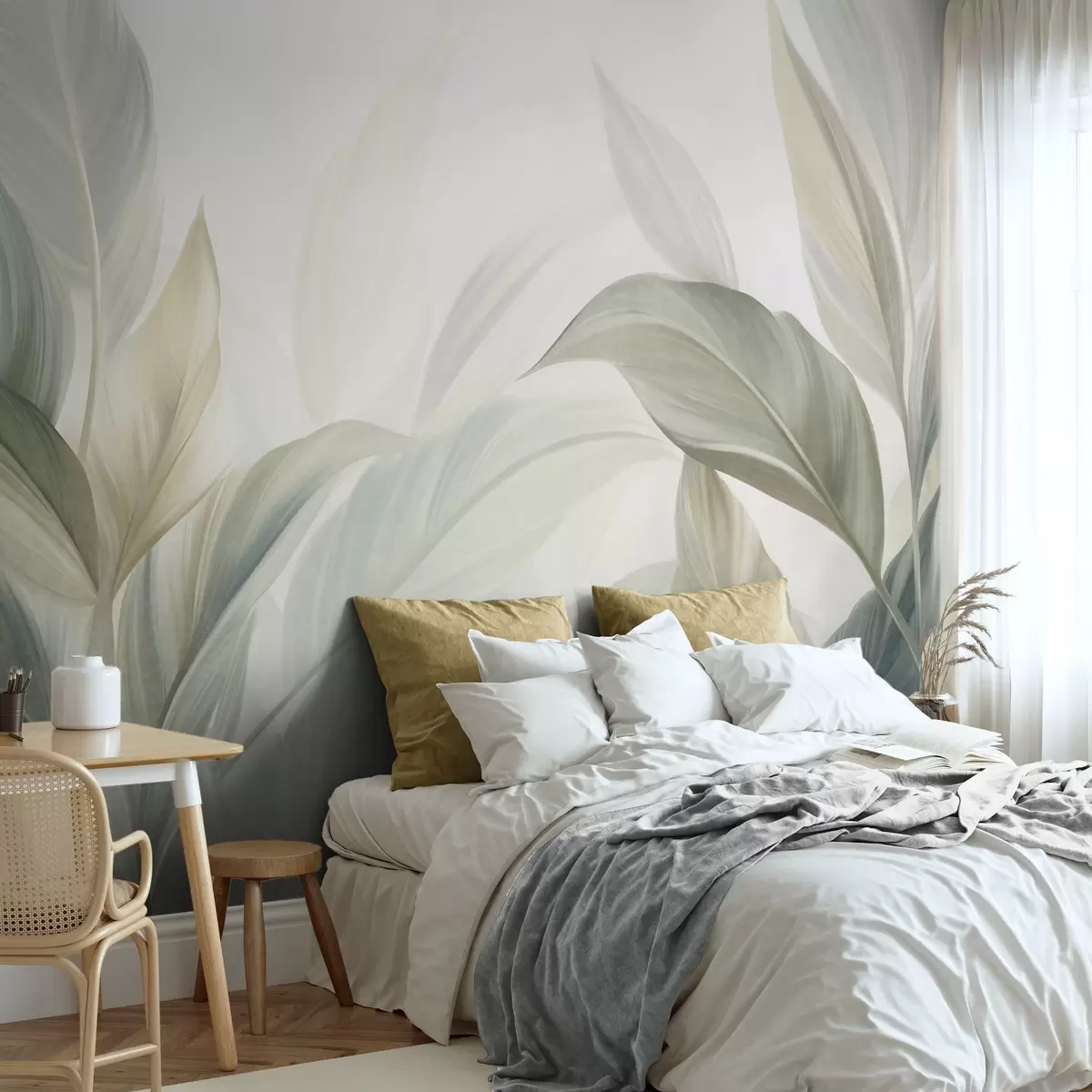 Papier peint De grandes feuilles tropicales vert pâle aux couleurs douces et pastel, dans un style artistique texturé N° w09816