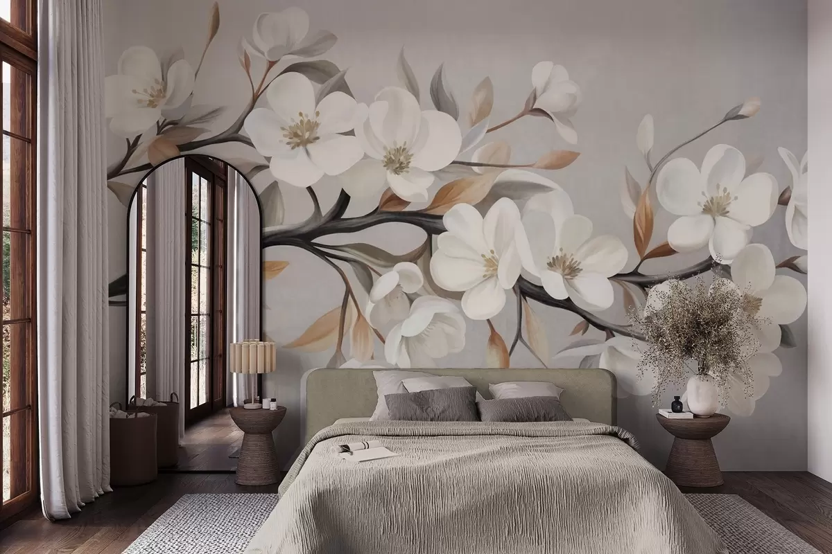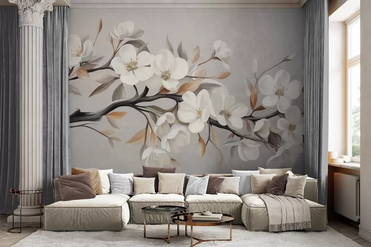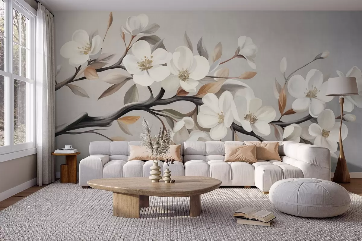 Papier peint Une branche texturée avec des fleurs blanches et des feuilles brunes sur fond gris clair N° w09817