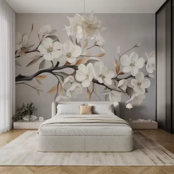 Papier peint Une branche texturée avec des fleurs blanches et des feuilles brunes sur fond gris clair N° w09817