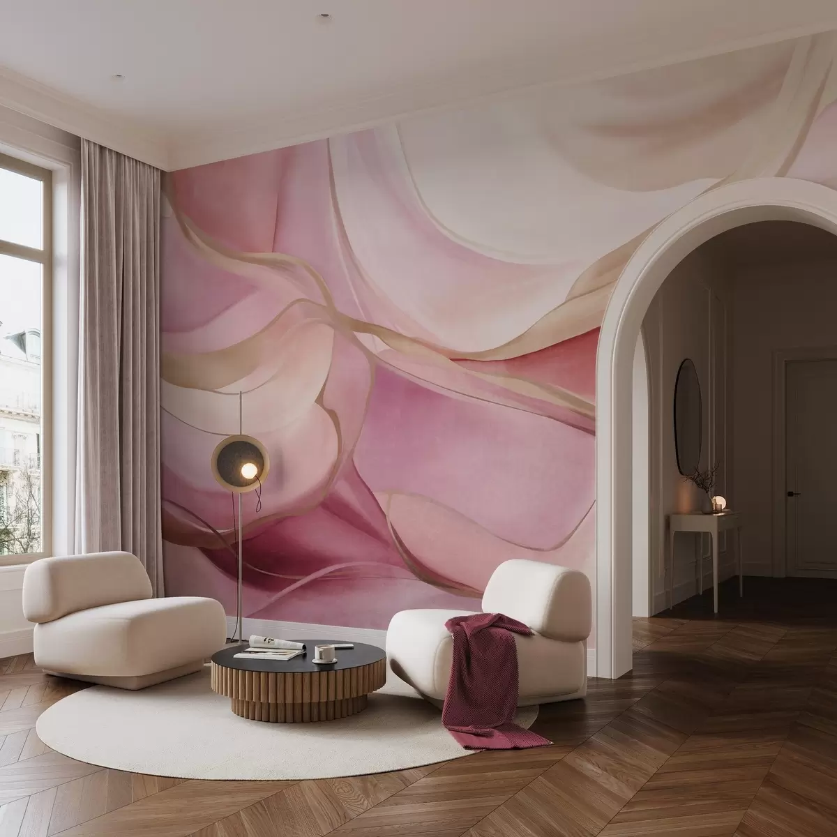 Papier peint Formes fluides aux textures abstraites, dans des tons de rose et de beige, rehaussées de délicates lignes jaunes N° w09818
