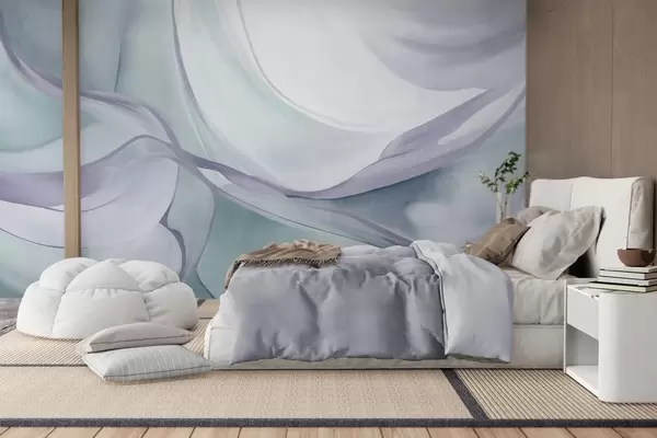 Papier peint Formes fluides aux textures abstraites, dans des tons de bleu et de gris, dessinées par des lignes délicates N° w09818v1