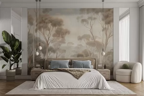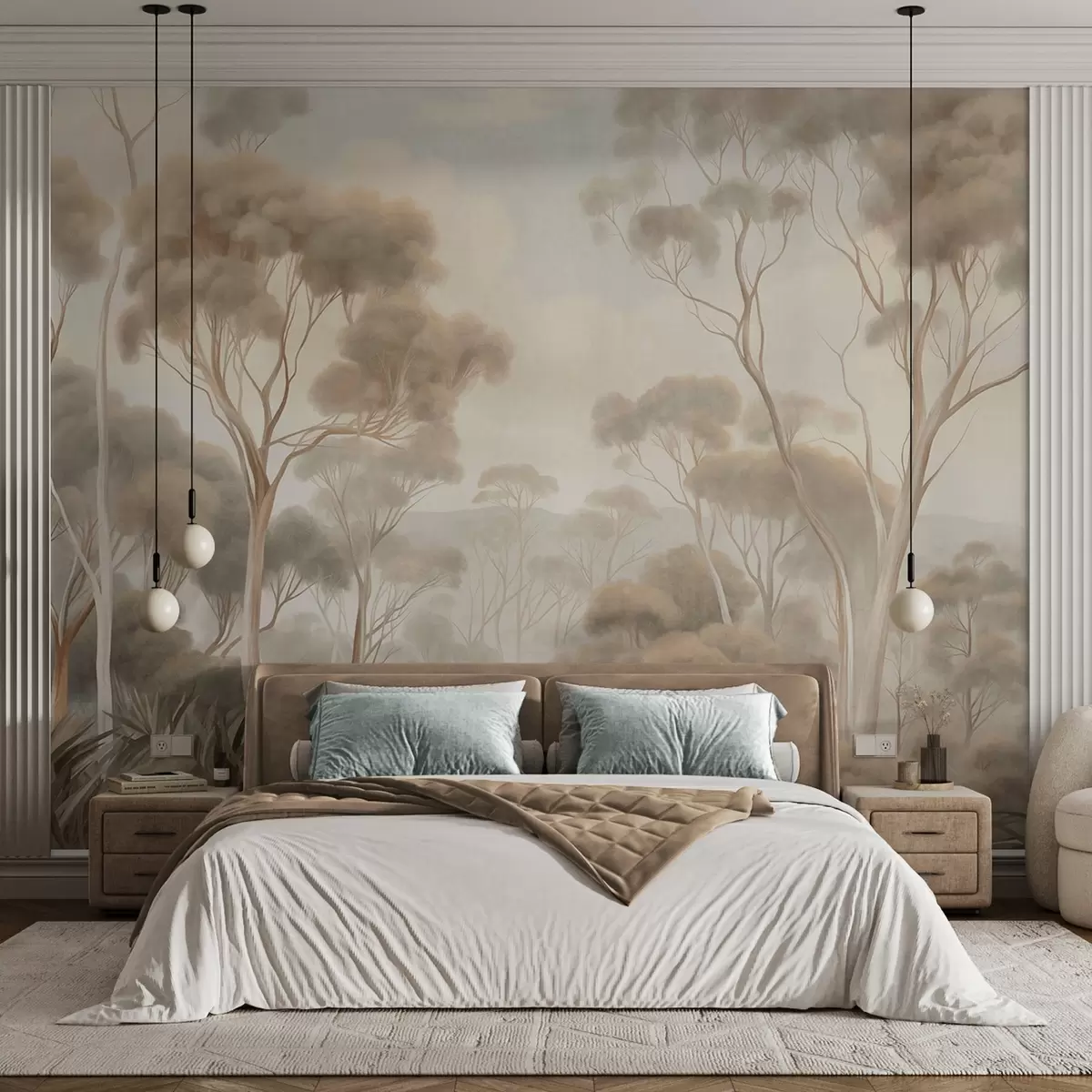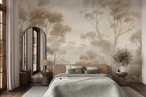 Papier peint Un paysage forestier brumeux avec de grands eucalyptus, des collines ondulantes sous un ciel nuageux, illustration texturée N° w09822