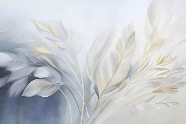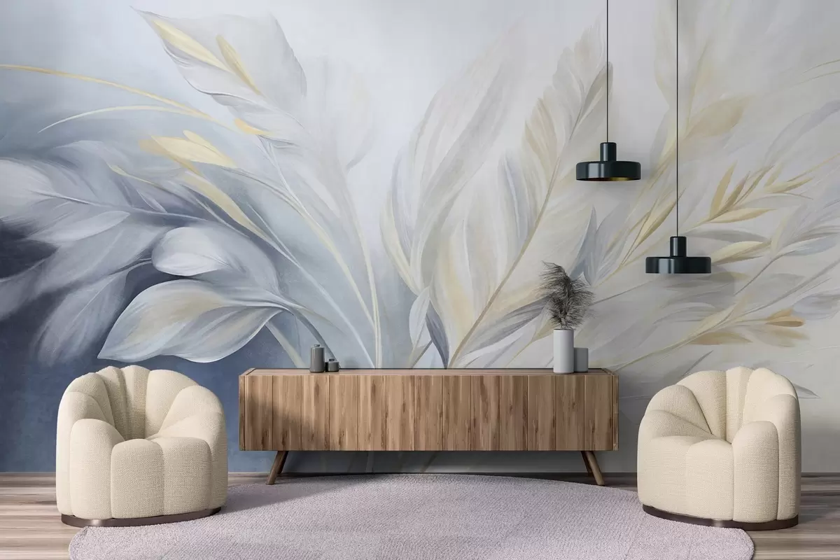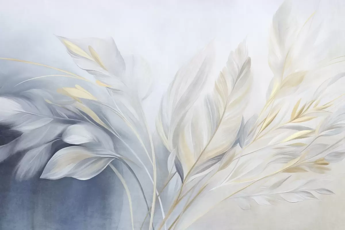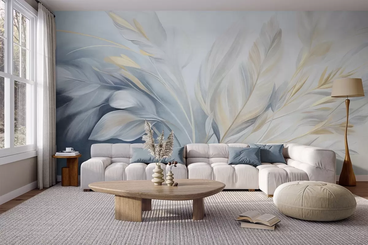 Papier peint Des plumes texturées rehaussées de touches jaunes, sur un fond délicat de bleu pâle et de blanc N° w09826