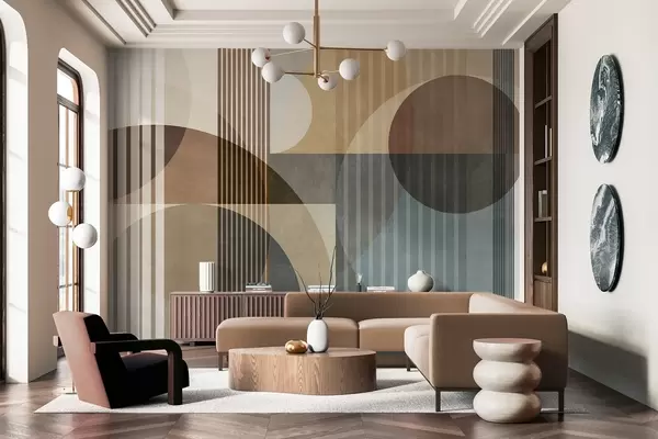 Papier peint Formes géométriques abstraites composées de cercles et de lignes, dans des tons ocres discrets, avec une composition texturée et superposée N° w09834