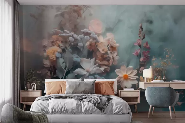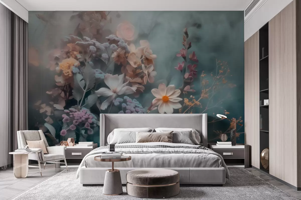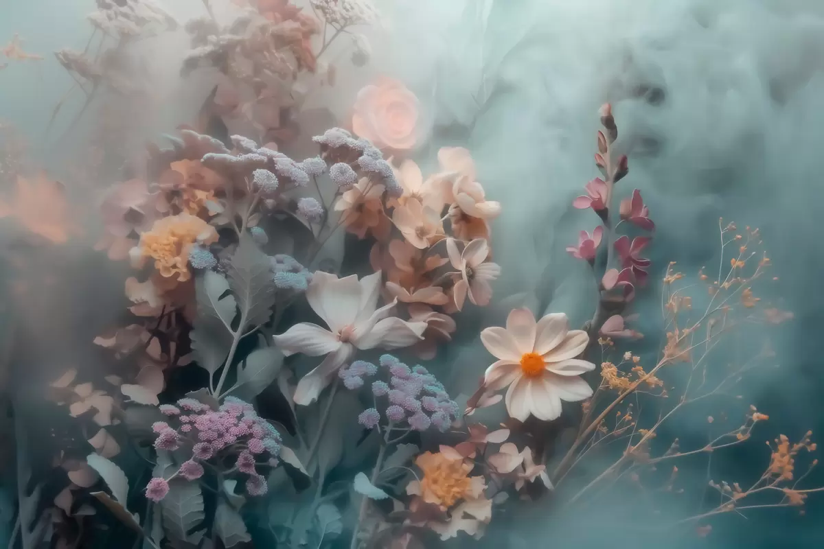 Papier peint Une composition envoûtante de fleurs sauvages, nappée d'une légère brume aux tons pastel N° w09846
