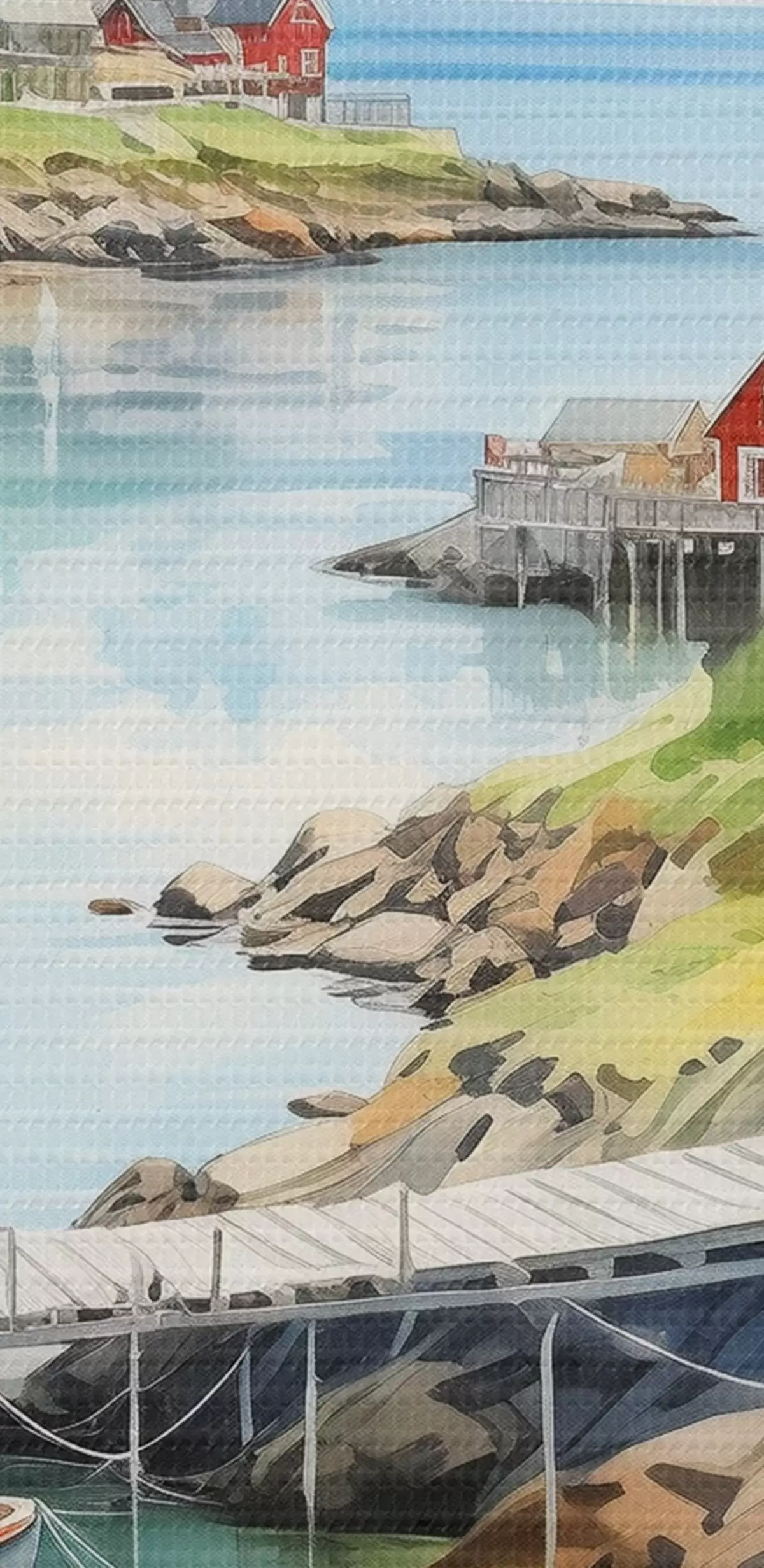 Tableau Norvège nature, îles Lofoten, paysage d'été, maisons rouges, montagnes, bateaux Nr m00421