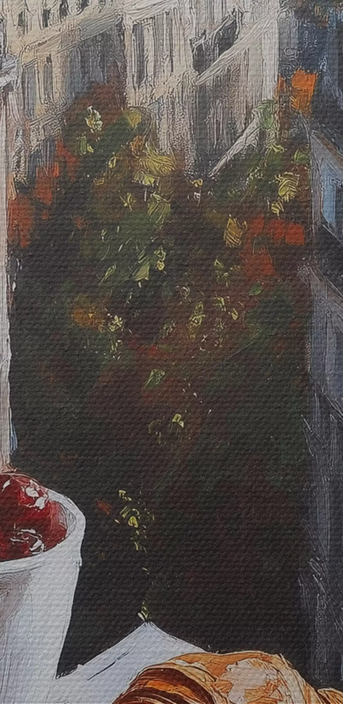 Tableau Vue de la ville sur un balcon à Paris, tour Eiffel, fraises, café, journal Nr m00445