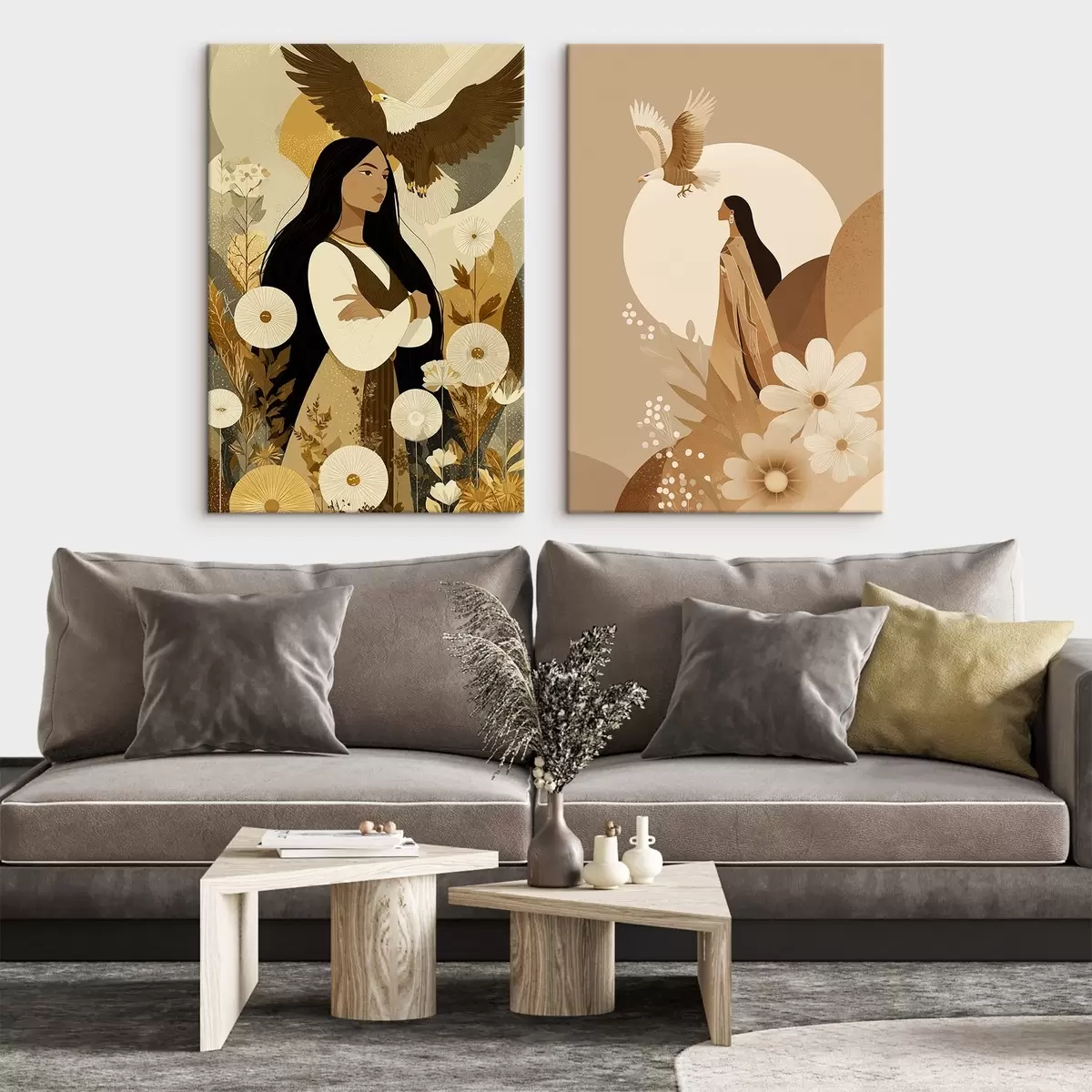 Tableau Femmes avec aigles volants, style tribal, couleurs beiges m00477