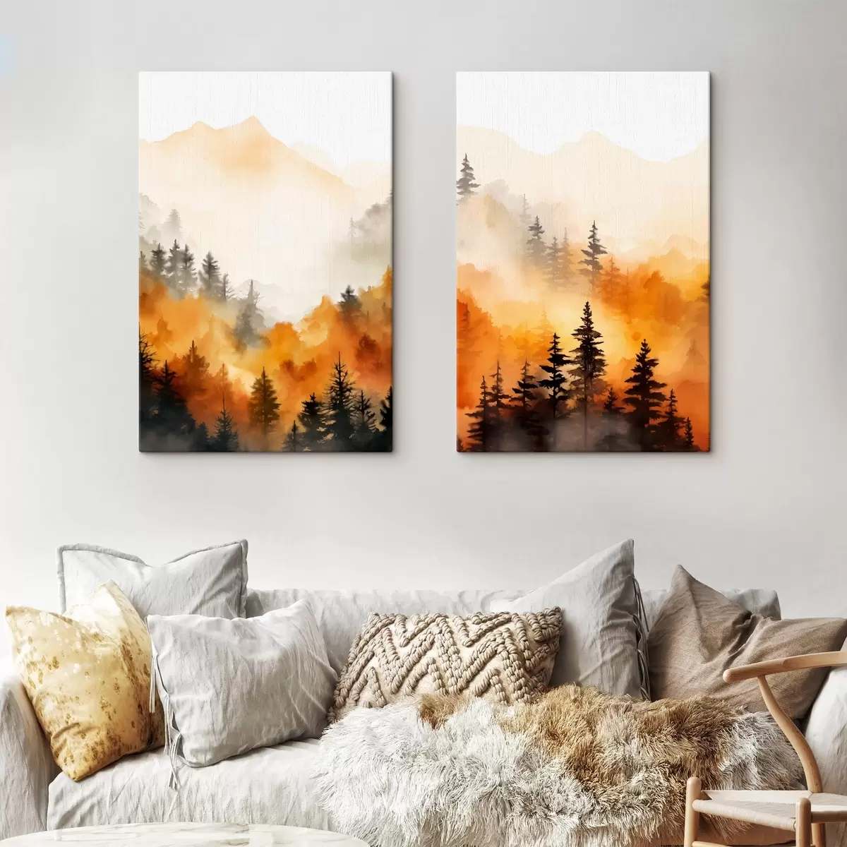 Tableau Peinture aquarelle d'un paysage imitant une forêt avec de grands pins et des montagnes en arrière-plan Nr m00519