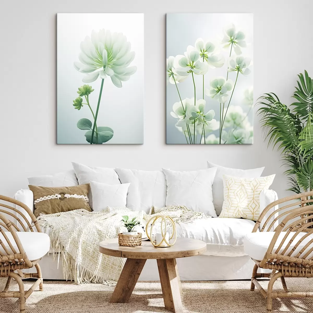 Tableau Fleurs de trèfle blanc avec tige et feuilles vertes, éclairage doux, arrière-plan propre, composition minimaliste, botanique Nr m00520