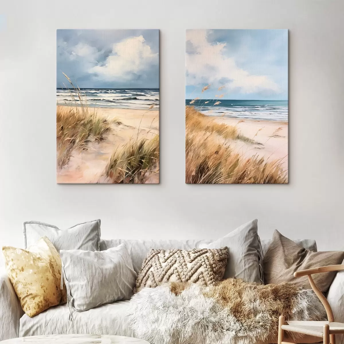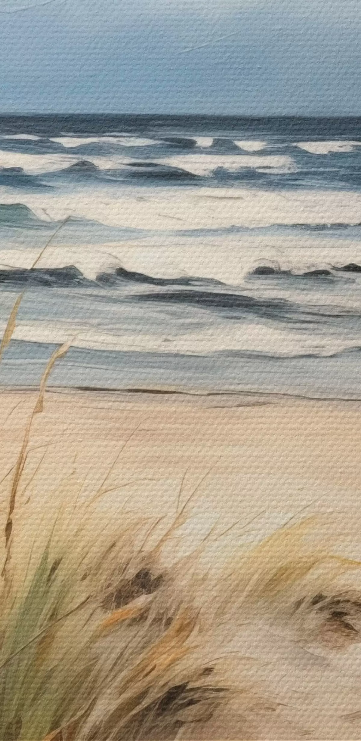 Tableau Une plage de sable avec des herbes hautes au premier plan, l'océan avec des vagues et un ciel nuageux à l'arrière-plan Nr m00521