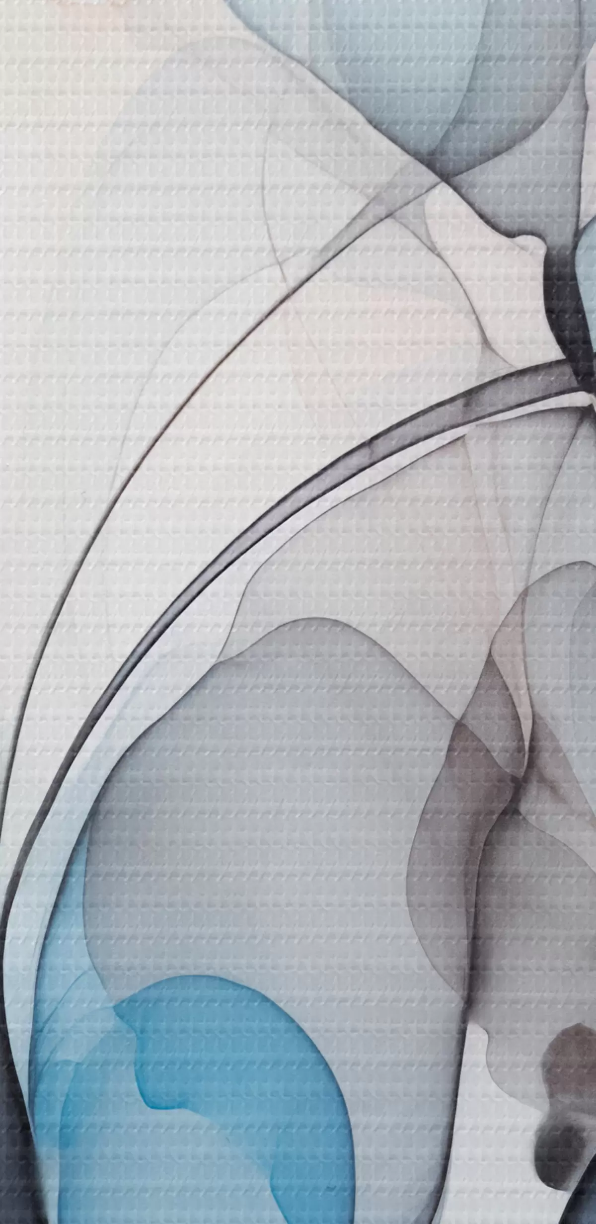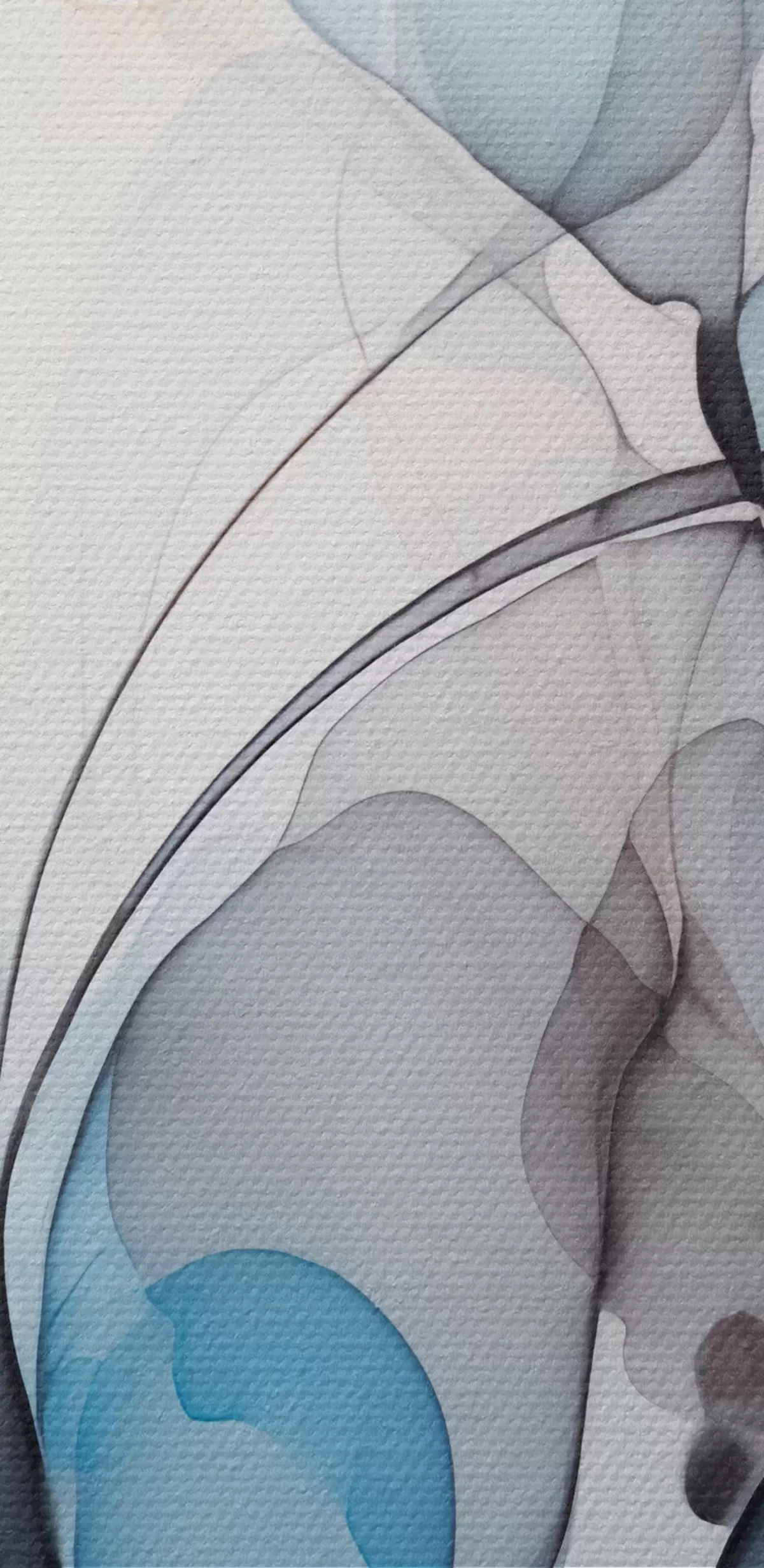Tableau Composition abstraite avec des lignes fluides et des pétales translucides dans les tons bleu blanc et beige, imitation encre à l'alcool Nr m00523