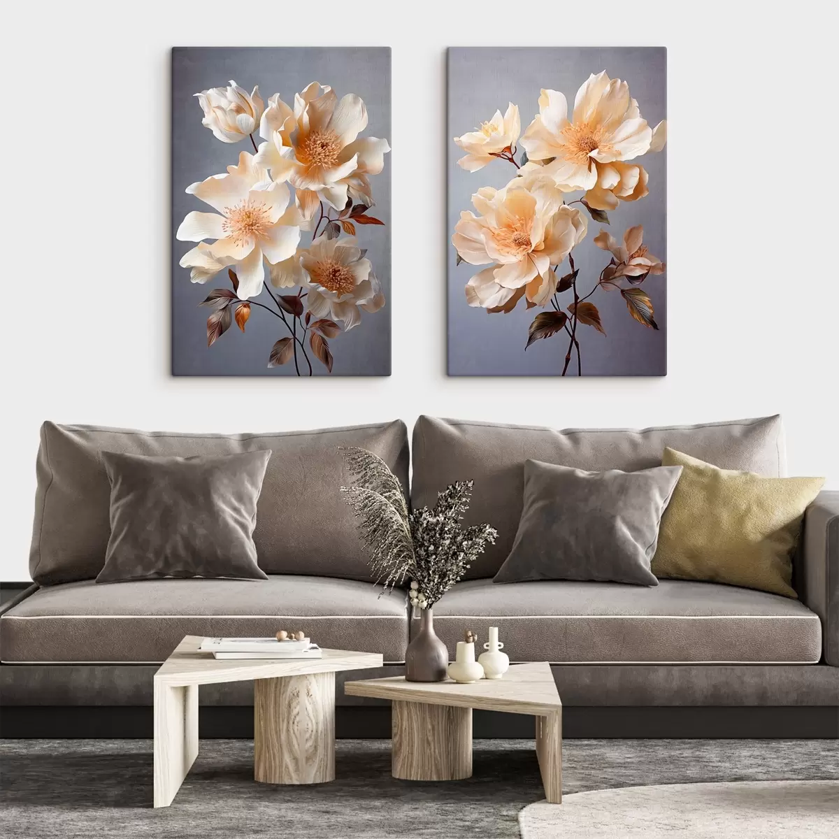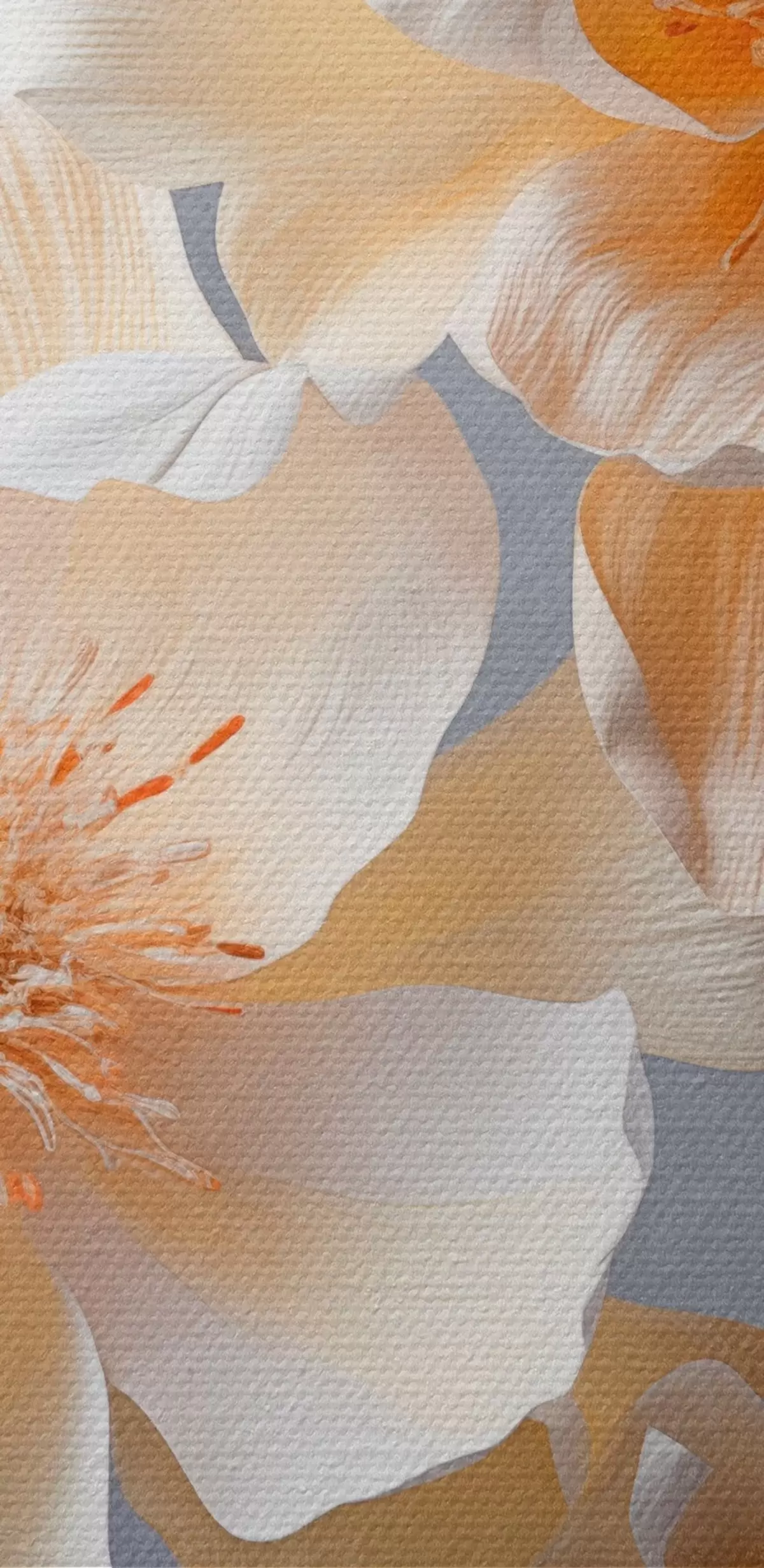 Tableau Fleurs texturées avec pistils orange et feuilles orange sur fond gris, lumière douce, élégant, détaillé, réaliste Nr m00525