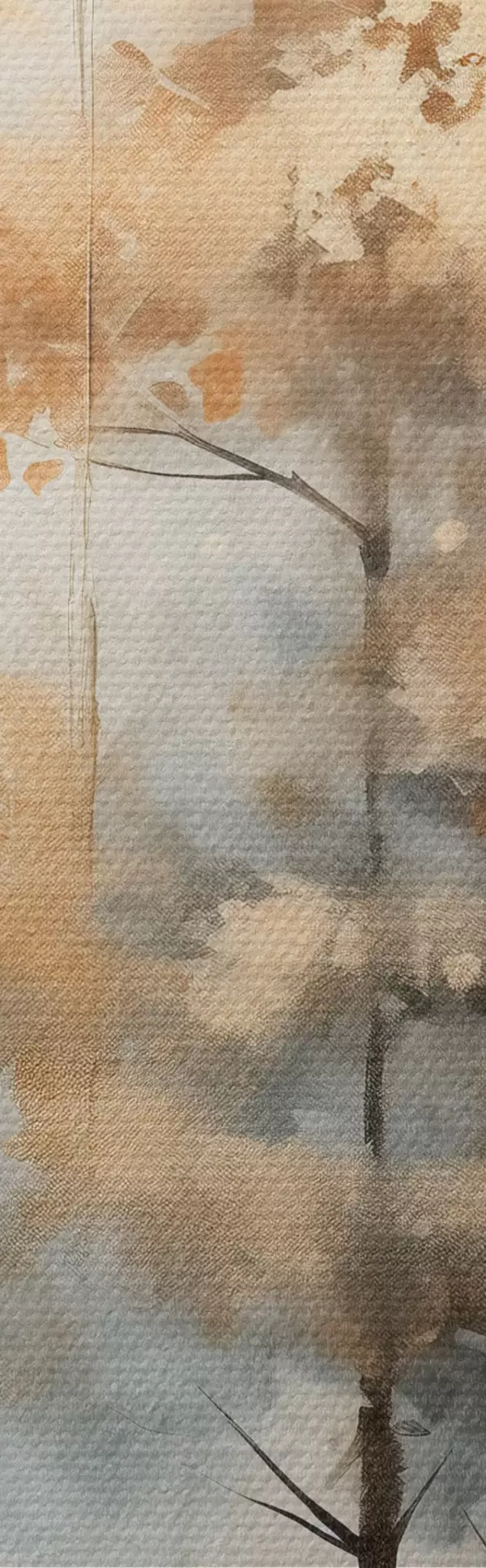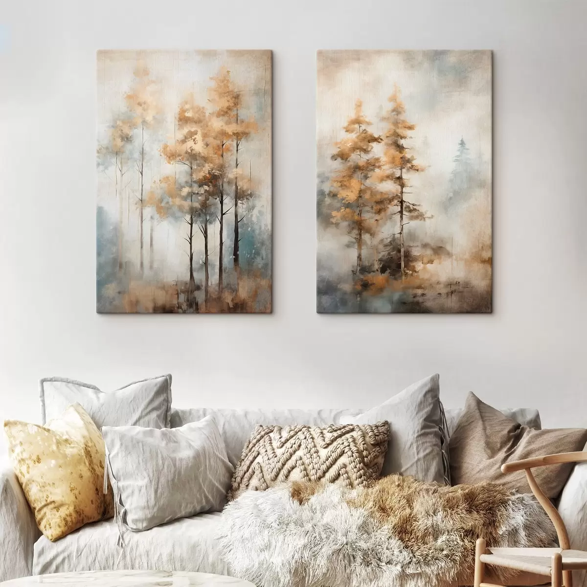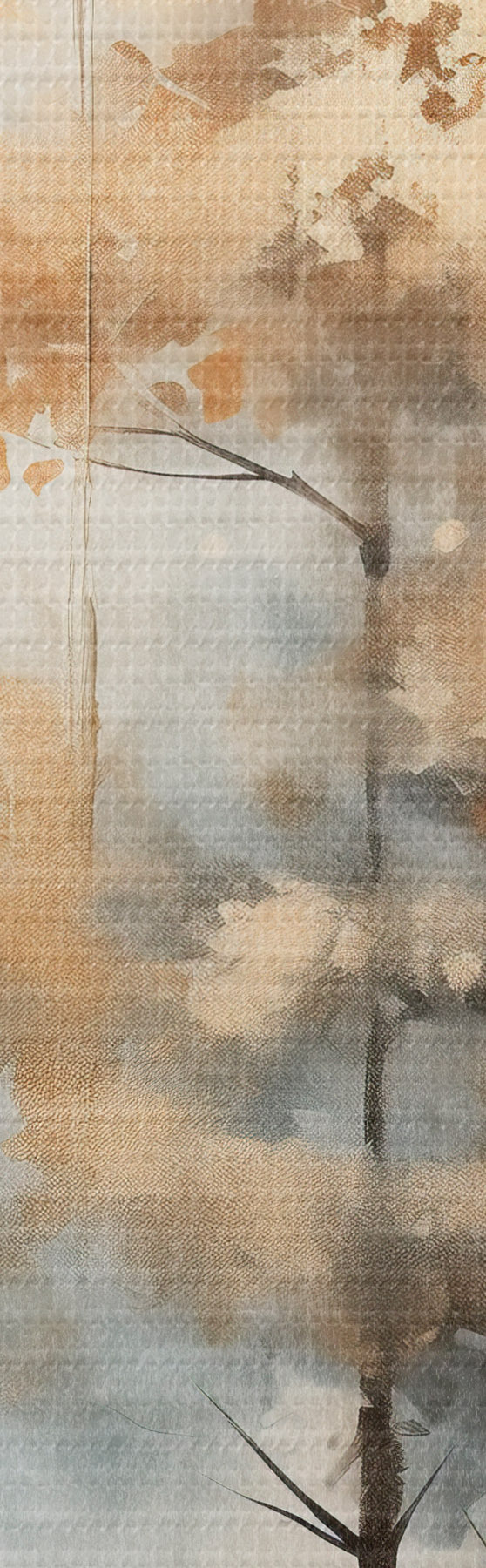 Tableau Grands arbres texturés avec des feuilles jaunes dans une forêt, l'arrière-plan est un mélange de tons bleus et bruns doux Nr m00528