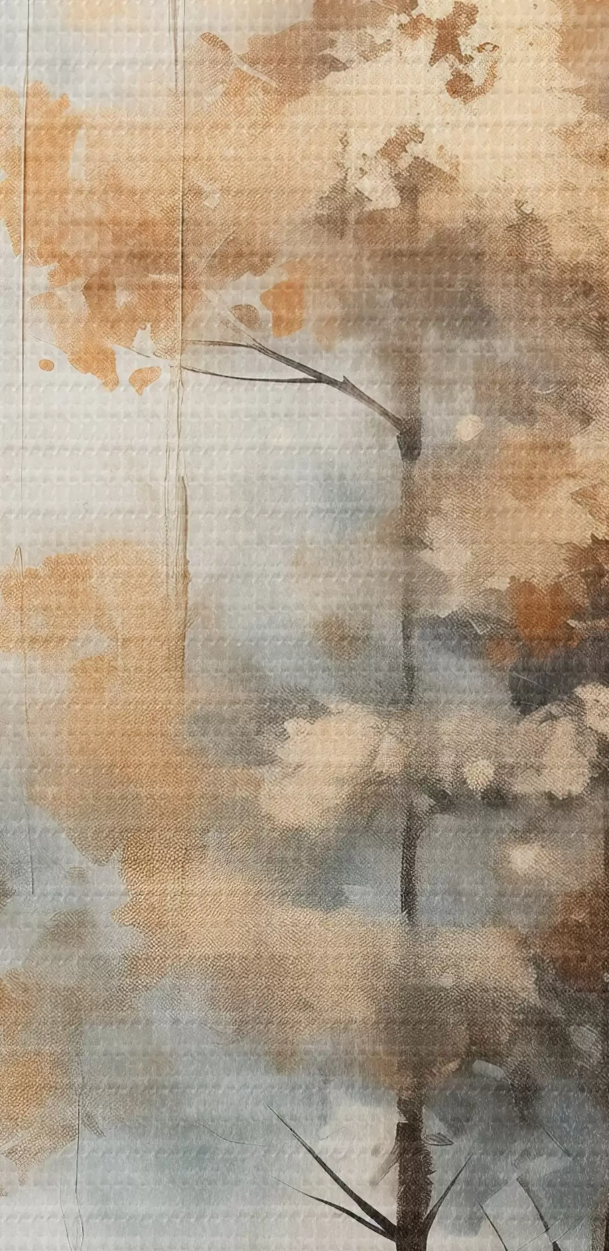 Tableau Grands arbres texturés avec des feuilles jaunes dans une forêt, l'arrière-plan est un mélange de tons bleus et bruns doux  m00528