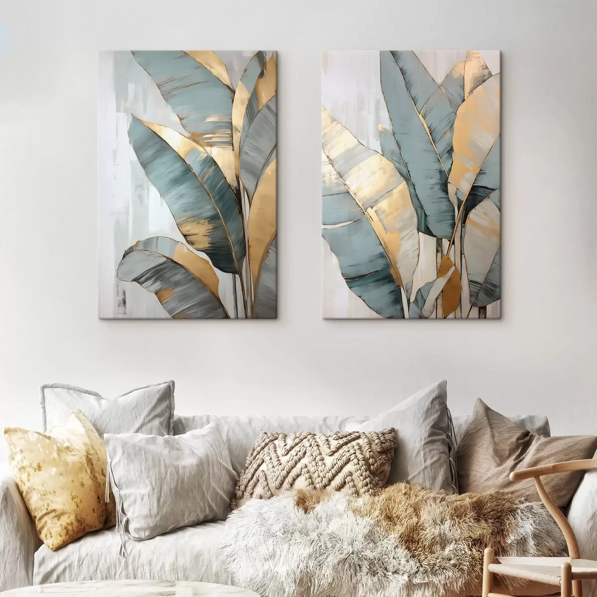 Tableau Un ensemble de feuilles de bananier bleues, grises et jaunes avec des coups de pinceau visibles, sur un fond blanc abstrait m00645