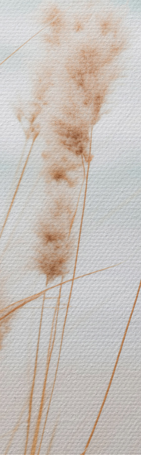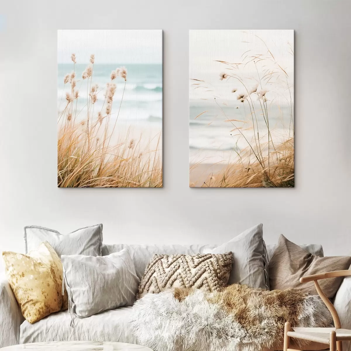 Tableau Herbe haute avec des têtes de graines duveteuses, plage de sable et vagues de l'océan en arrière-plan, palette de couleurs douces et sourdes Nr m00650