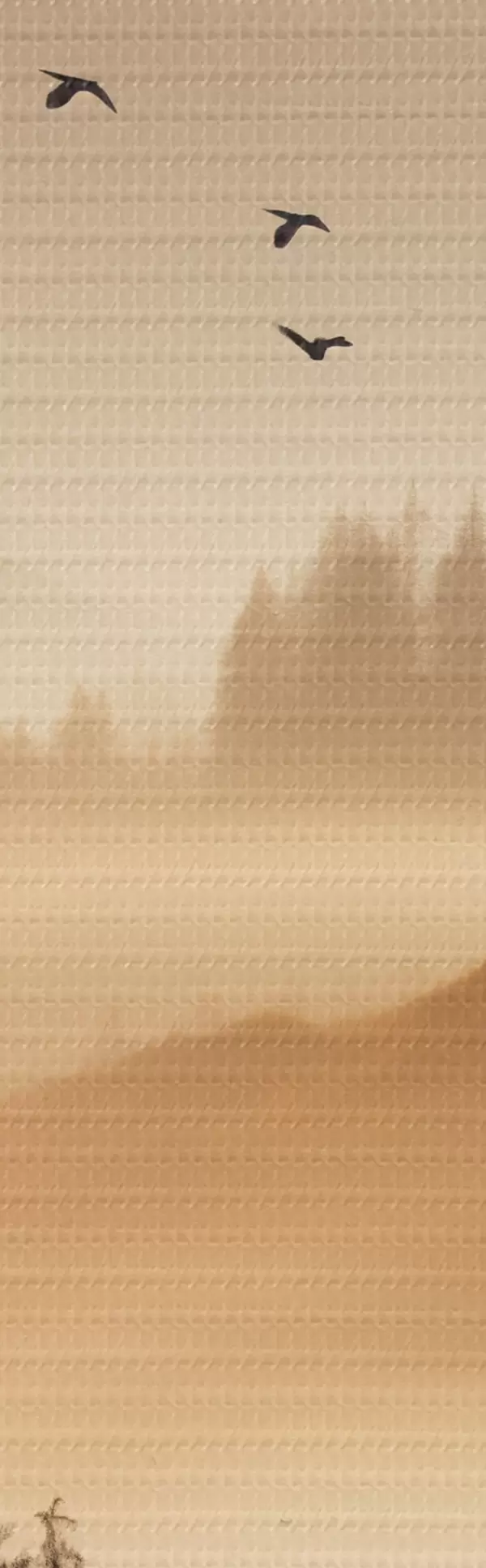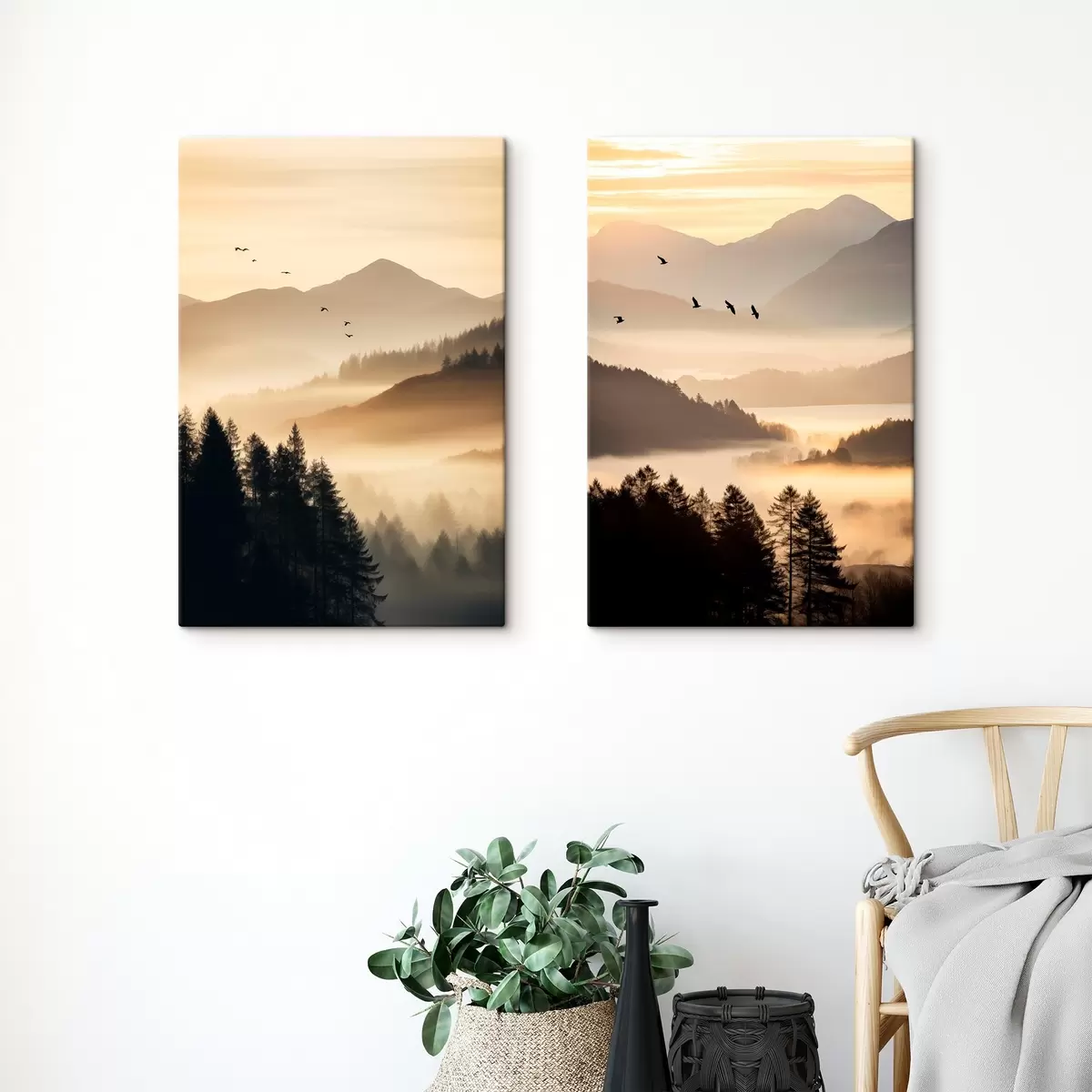 Tableau Un paysage de montagne avec une forêt et des oiseaux volant dans le ciel, le tout recouvert d'une épaisse couche de brouillard au lever du soleil Nr m00651