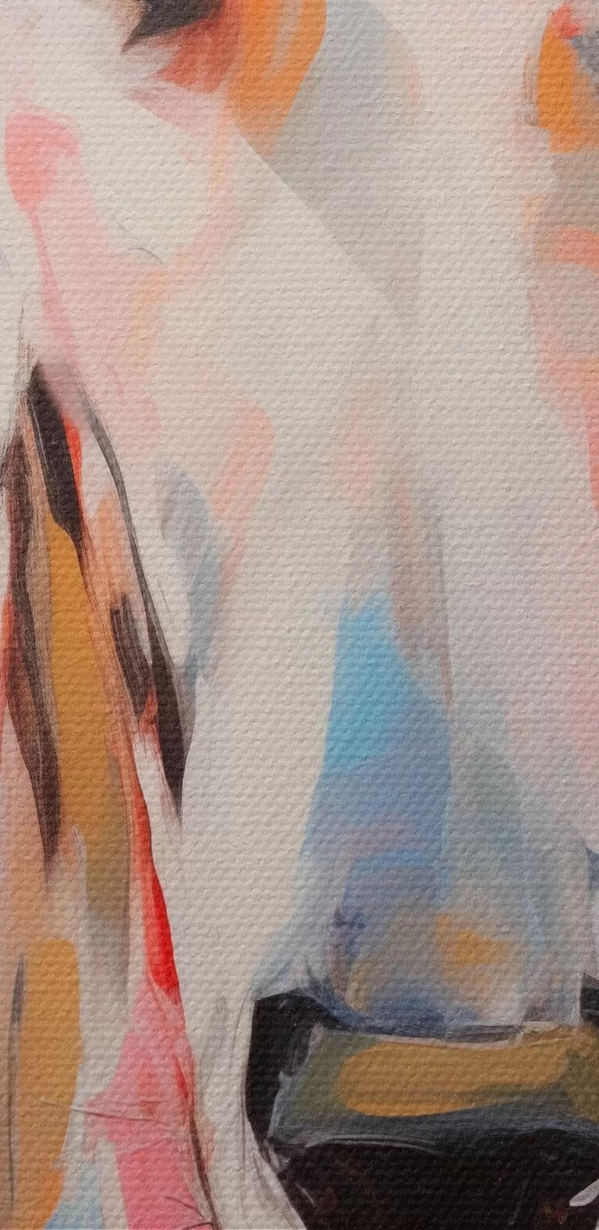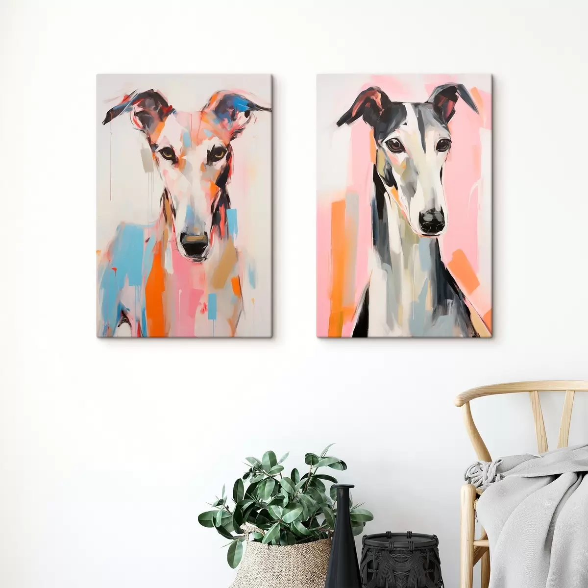Tableau Un chien lévrier, peint avec des couleurs vives comme l'orange, le rose et le bleu, sur un fond blanc uni Nr m00652
