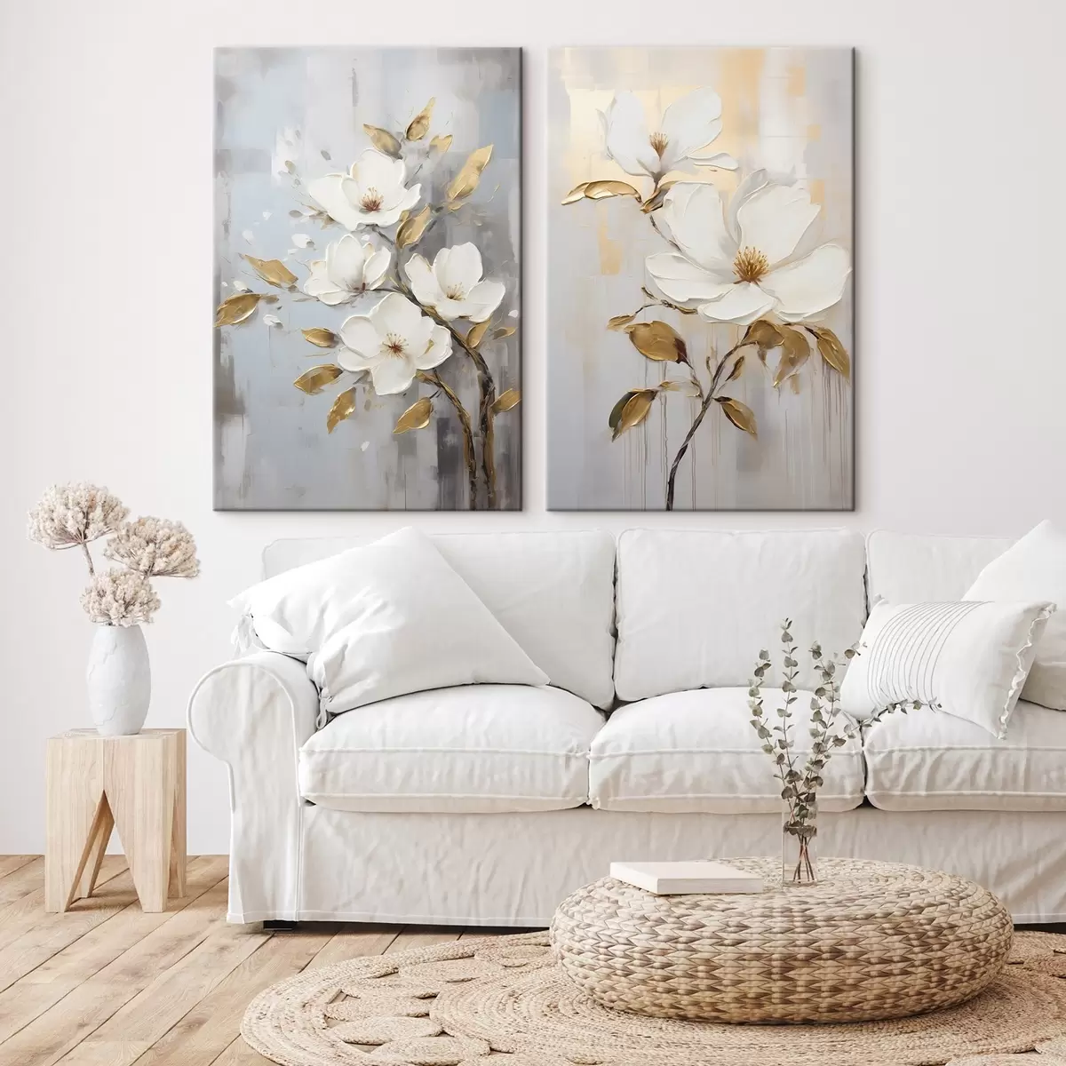 Tableau Deux fleurs blanches avec des feuilles jaune-orange sur un fond clair m00687