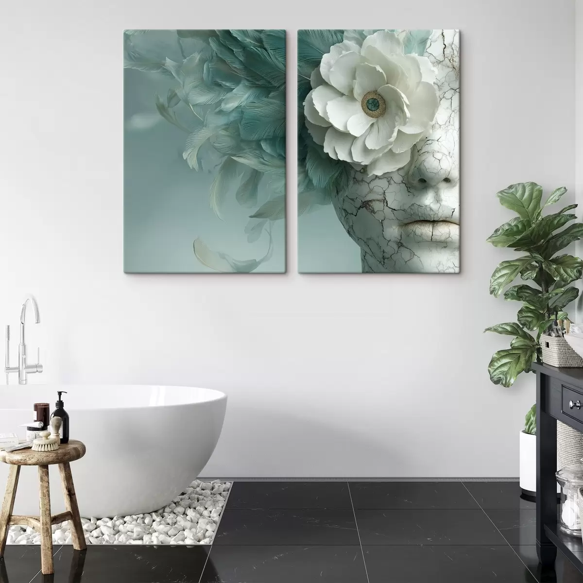 Tableau visage en marbre d'une fille avec une fleur et des plumes Nr m00699