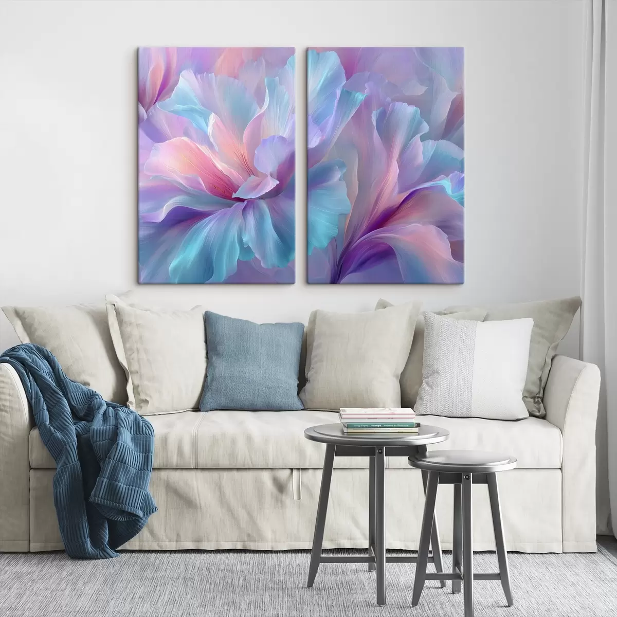 Tableau une délicate fantaisie florale aux pétales dans les tons violet, bleu et rose. m00700