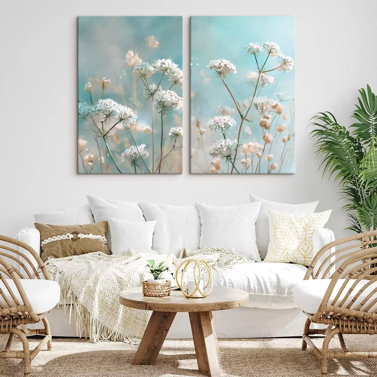 Tableau Fleurs de Queen Anne's Lace peintes à l'aquarelle sur fond bleu m00705
