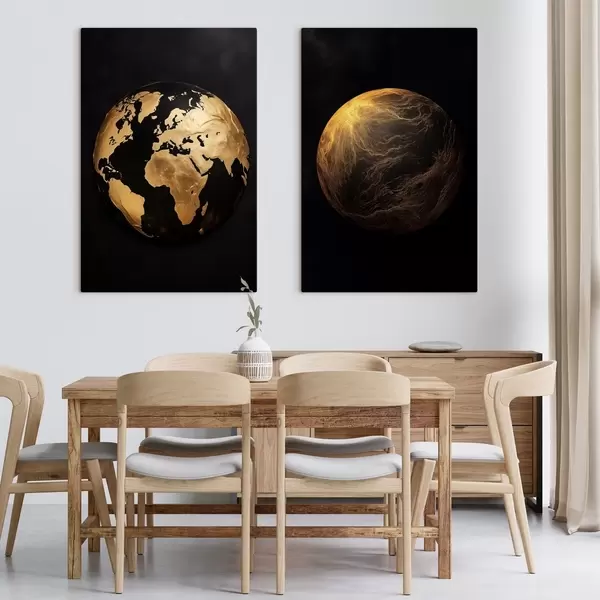 Tableau Globe terrestre et planète abstraits texturés sur fond noir, art minimaliste moderne Nr m00827