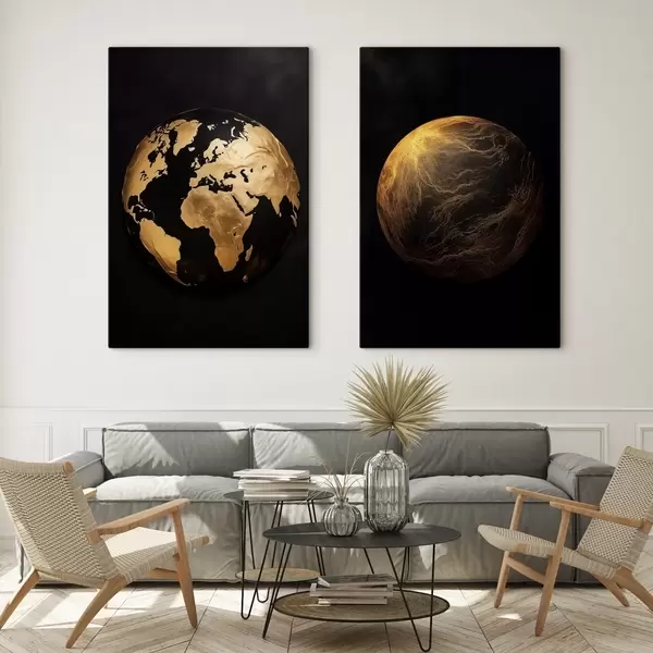 Tableau Globe terrestre et planète abstraits texturés sur fond noir, art minimaliste moderne Nr m00827