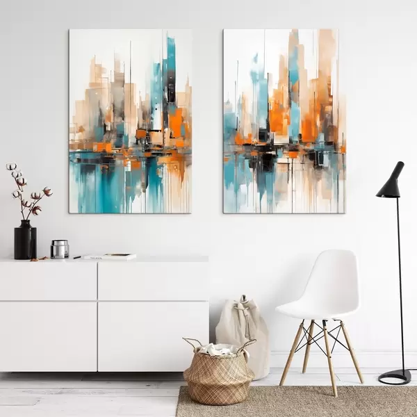 Tableau Paysage urbain abstrait avec des coups de pinceau verticaux dans des tons orange, bleu et blanc, style pictural Nr m00876