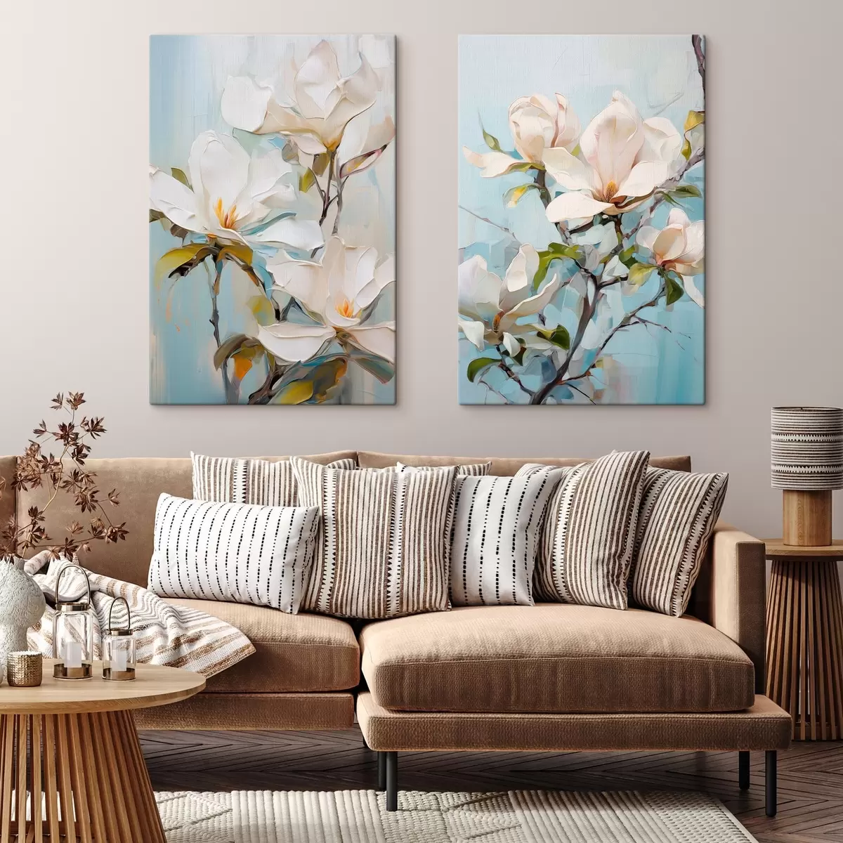 Tableau Fleurs de magnolia blanches, fond bleu clair avec des coups de pinceau doux, style peinture à l'huile, texture impasto m00881