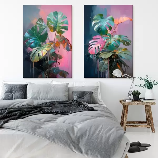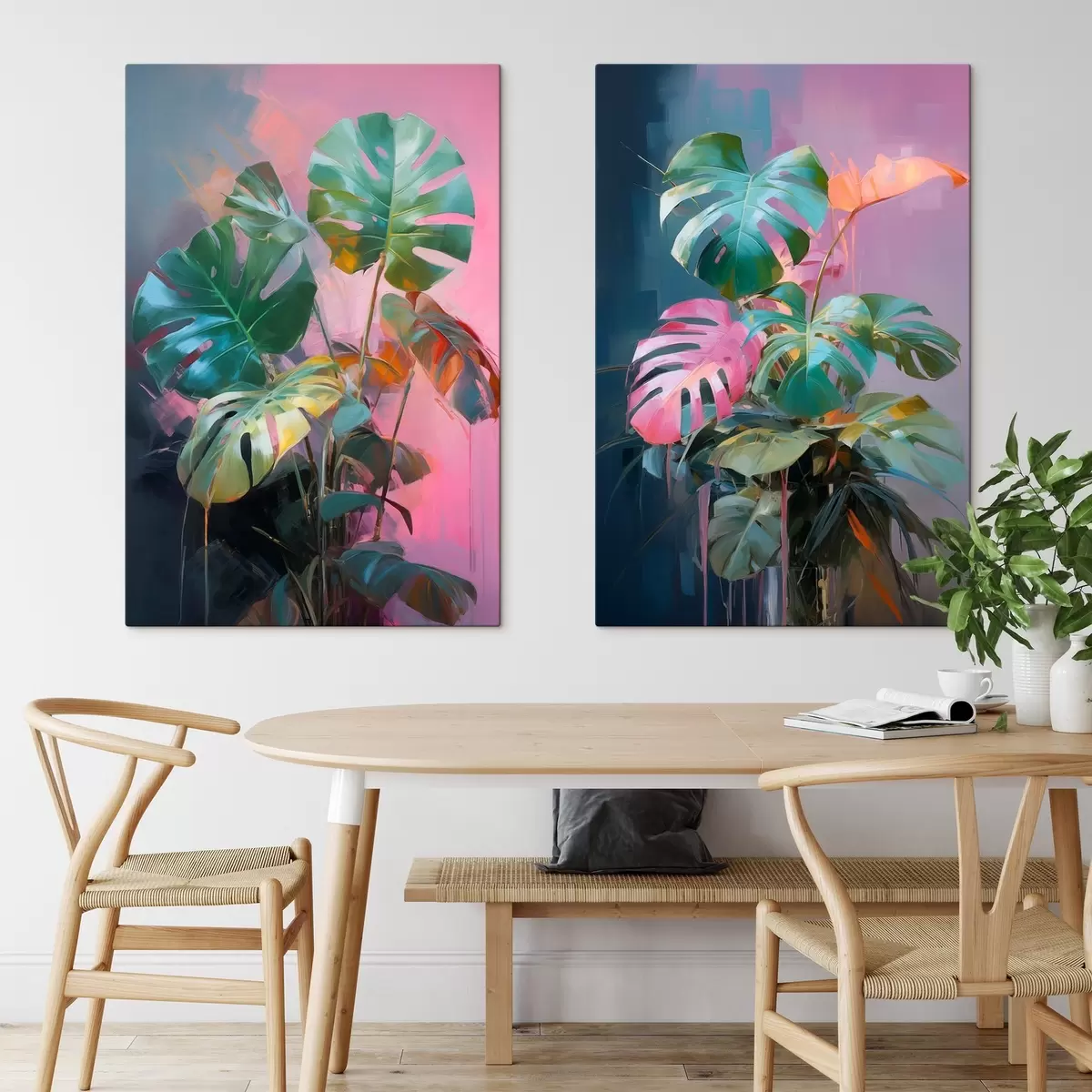 Tableau Plante abstraite monstera aux feuilles d'un vert éclatant, sur fond de douces teintes roses et violettes Nr m00886