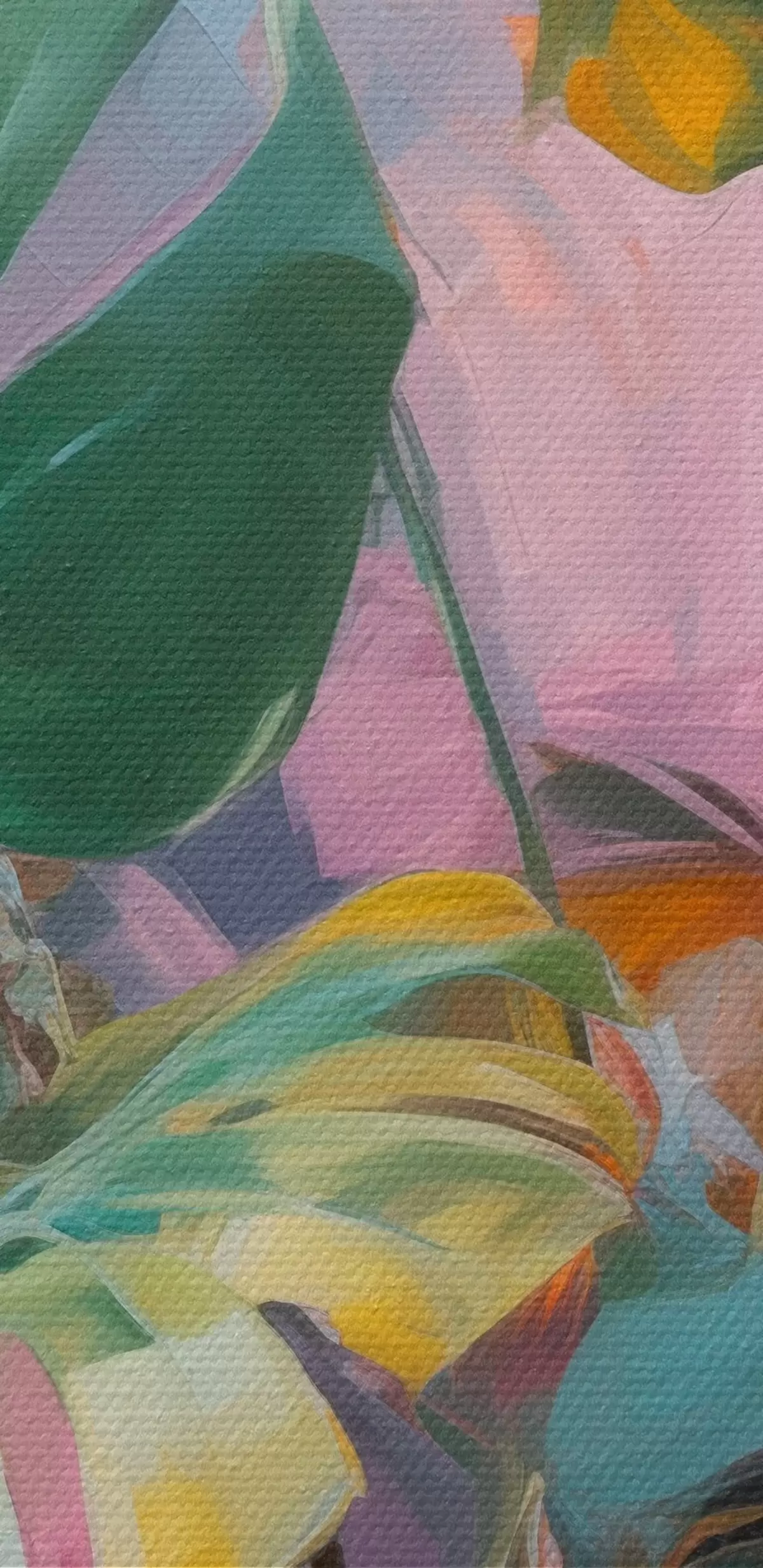 Tableau Plante abstraite monstera aux feuilles d'un vert éclatant, sur fond de douces teintes roses et violettes m00886