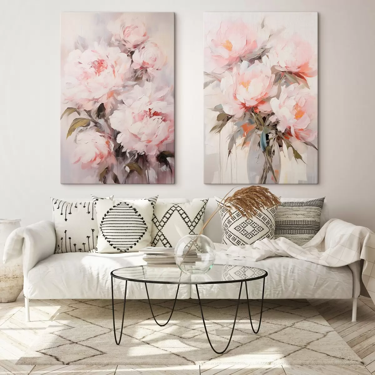 Tableau Bouquet de pivoines rose pâle avec des feuilles vertes, coups de pinceau doux, couleurs pastel, sur fond clair Nr m00890